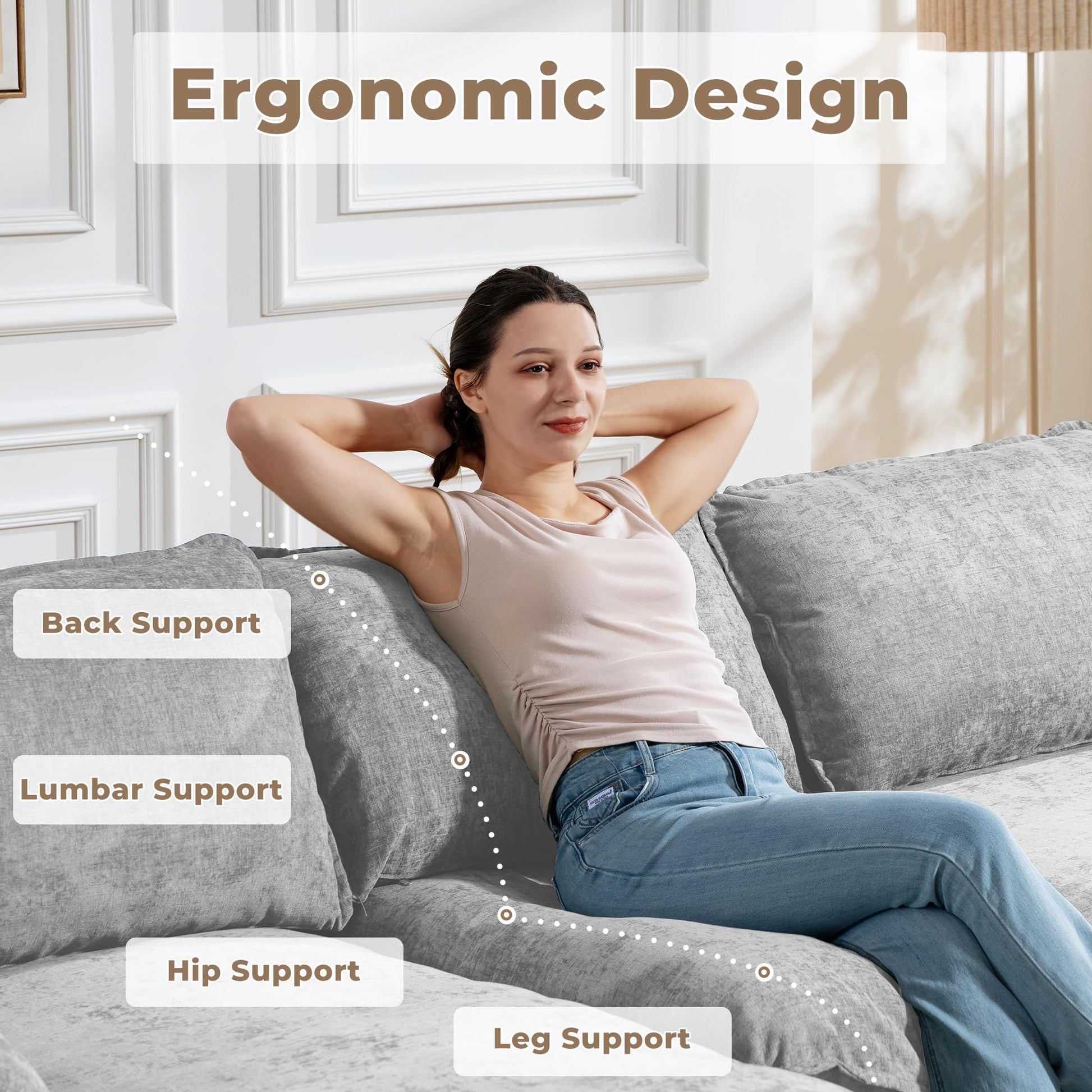 Experience ultimate comfort with this modern modular sectional sofa featuring a deep seat design and boneless construction. The chenille upholstery provides a soft, luxurious feel while the L-shaped configuration maximizes seating space. Perfect for living rooms and bedrooms, this cloud couch offers exceptional relaxation without requiring any assembly.