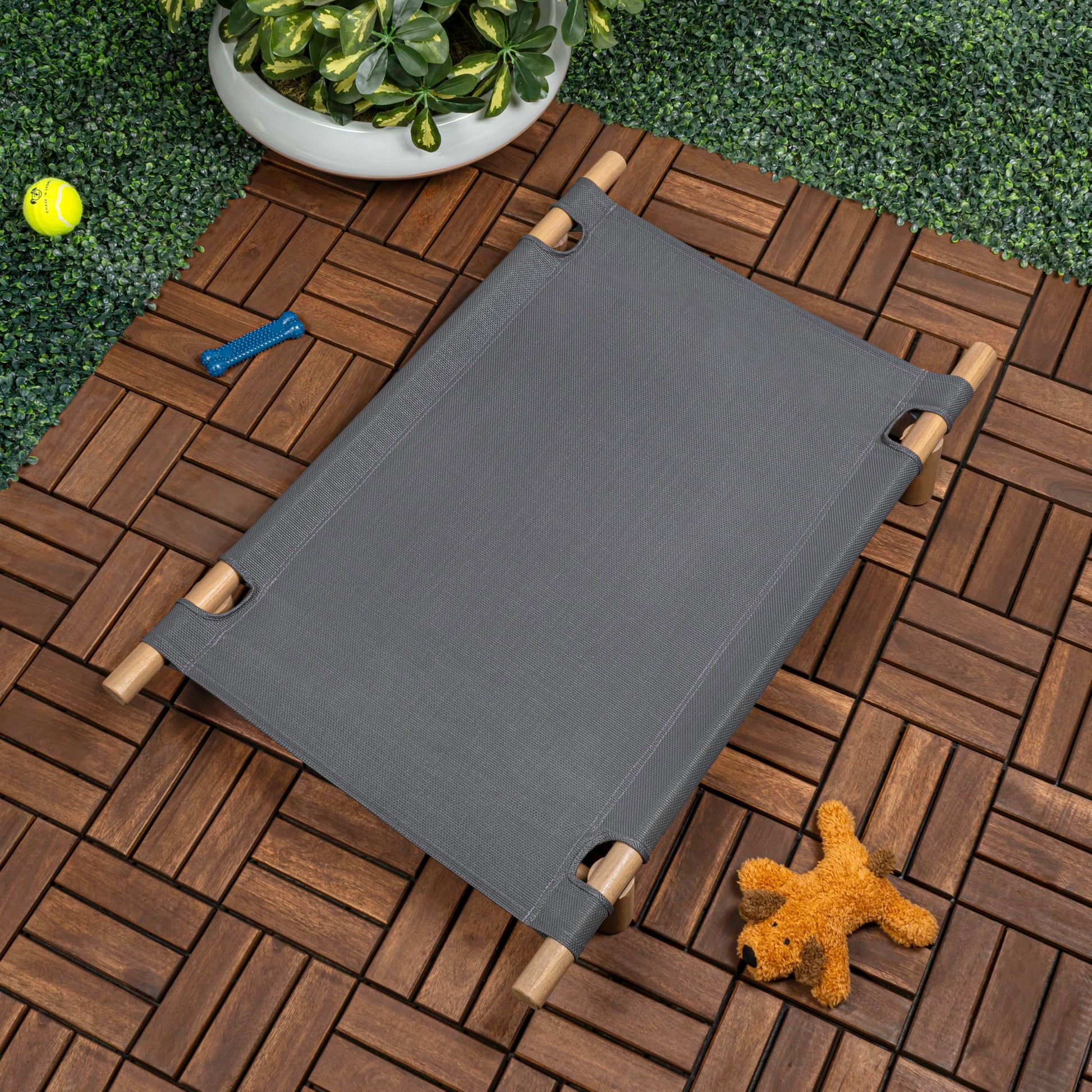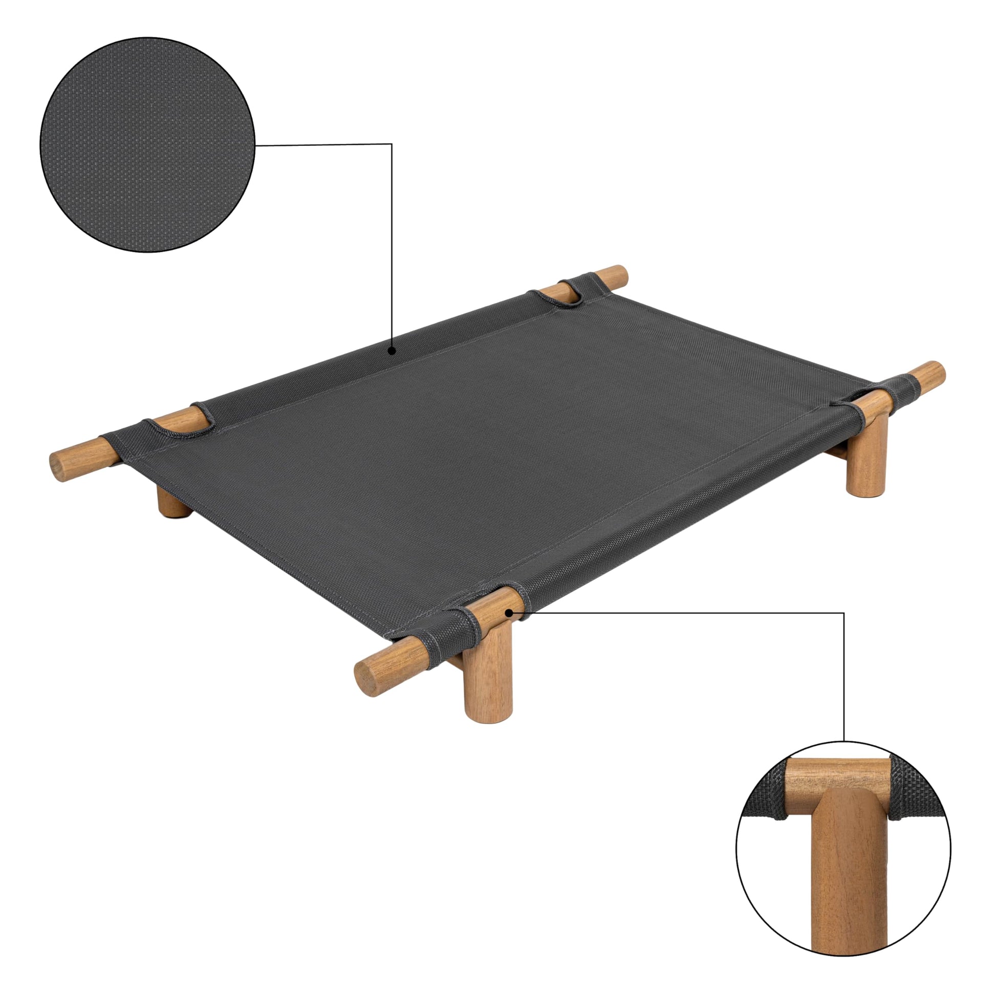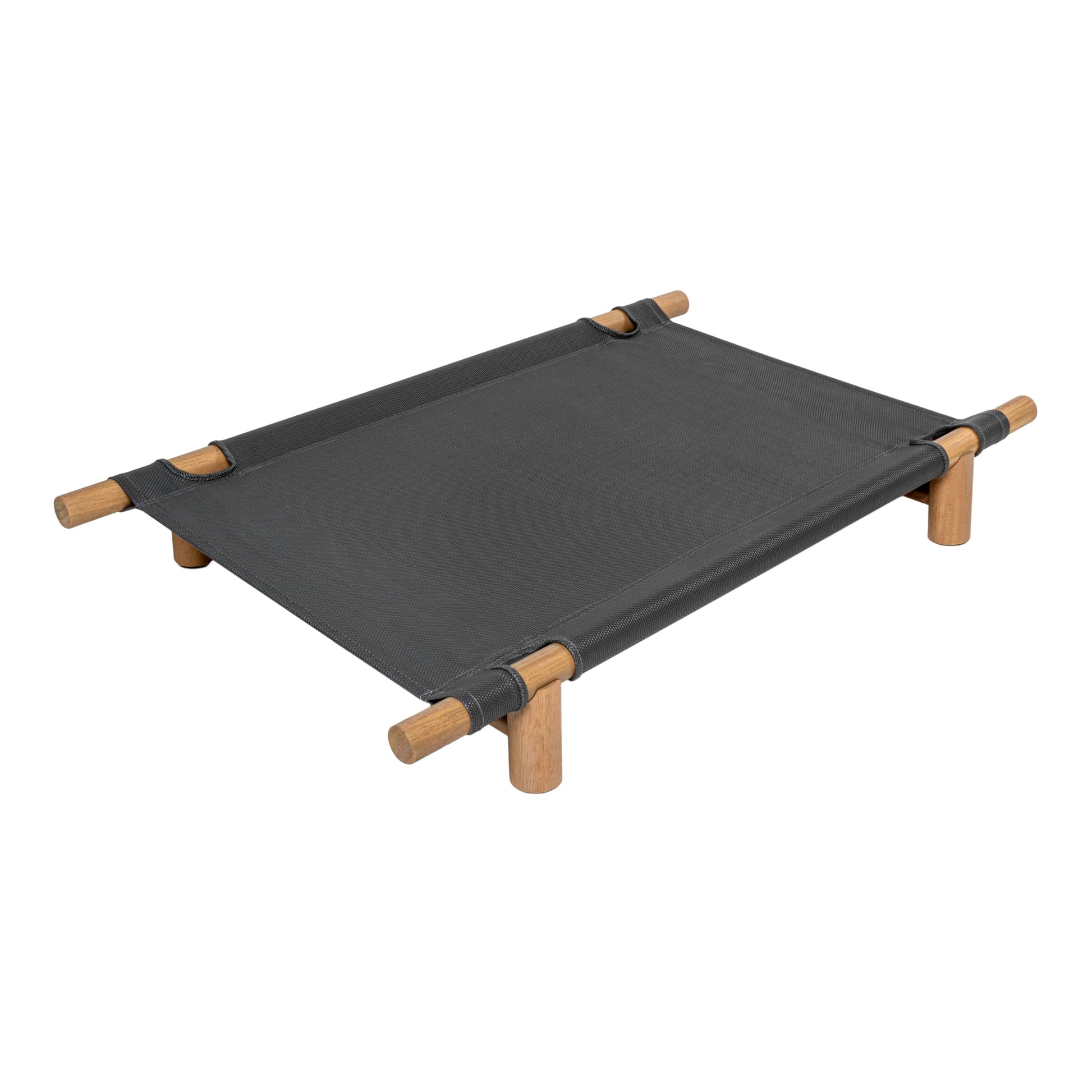 This elevated outdoor dog bed combines modern minimalist design with durable construction, perfect for keeping your pet comfortable and off the ground. The wood frame construction provides stability and style, while the graphite and light teak finish complements any outdoor space.