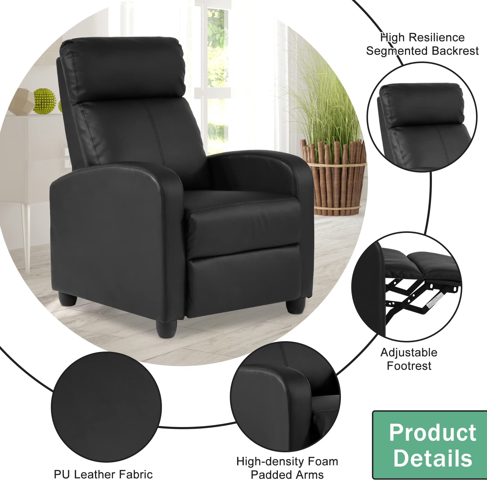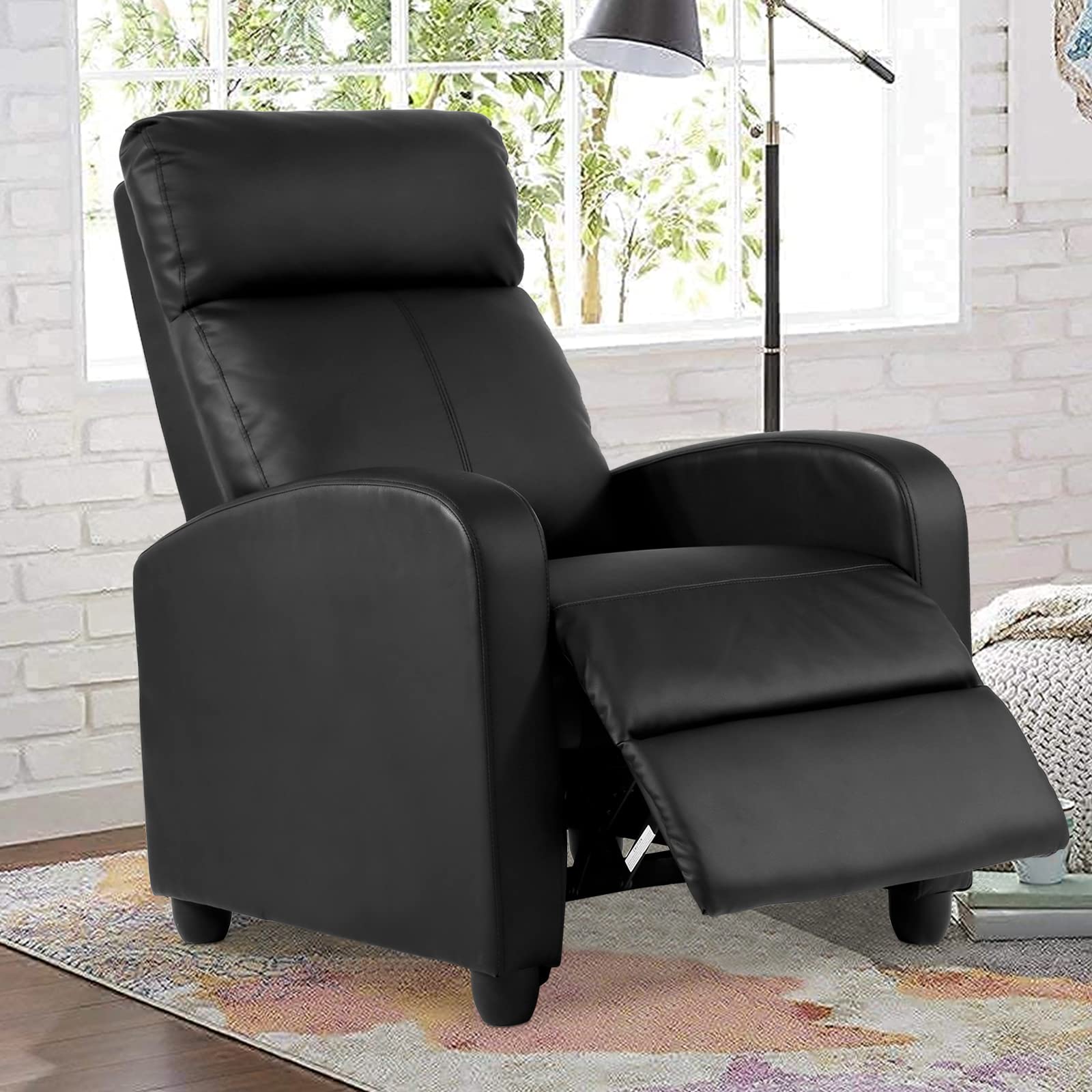 CL.HPAHKL Living Room Recliner Chair Modern Reclining Easy Lounge Winback Single Sofa Reading Chair PU Leather Home Theater Seating Adjustable Accent Armchair w/Thick Seat Cushion & Backrest, Black