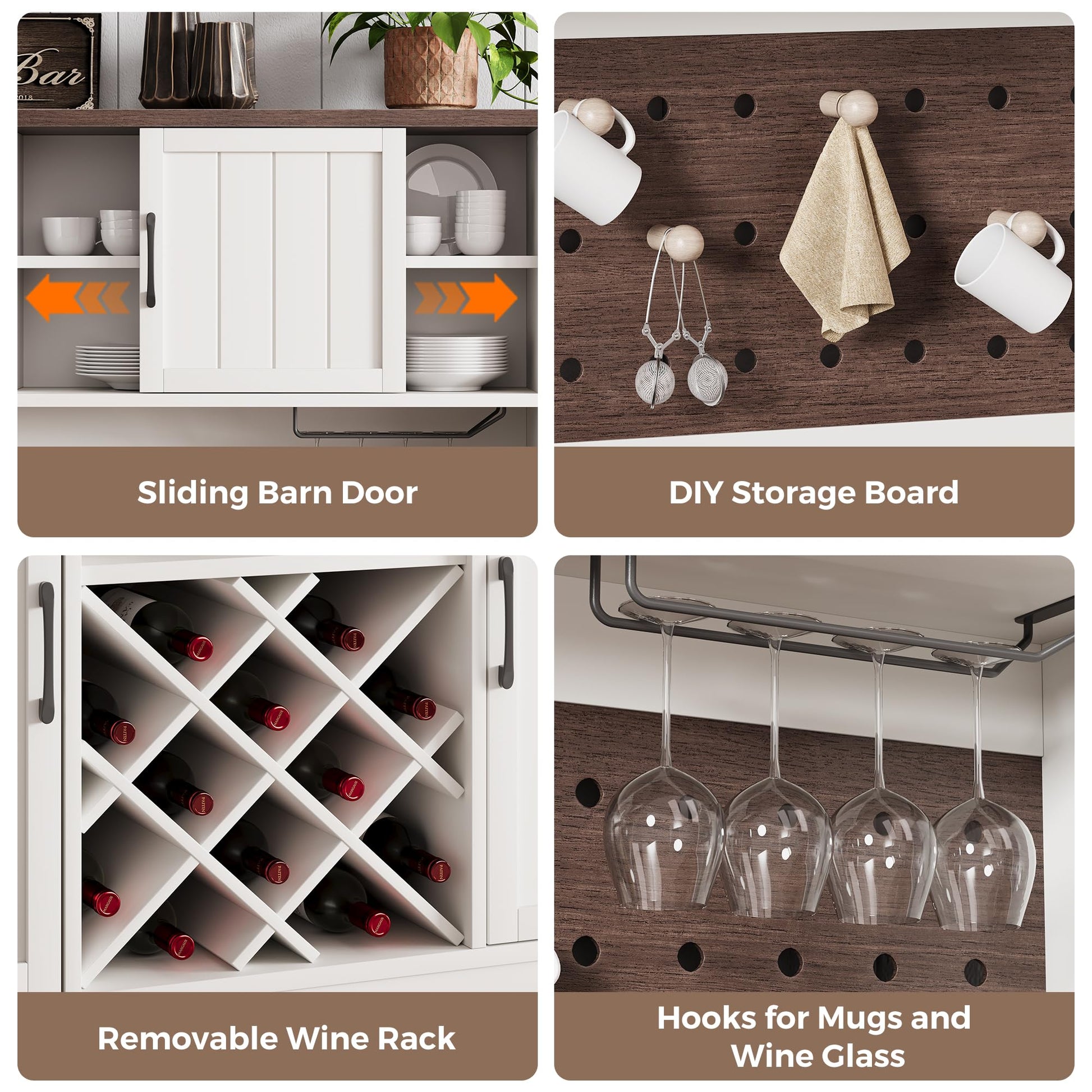 This farmhouse-style coffee bar cabinet combines functionality with elegant design. Featuring a sliding barn door, integrated power outlet, and LED lighting, this tall storage solution is perfect for organizing your kitchen, dining room, or home bar.