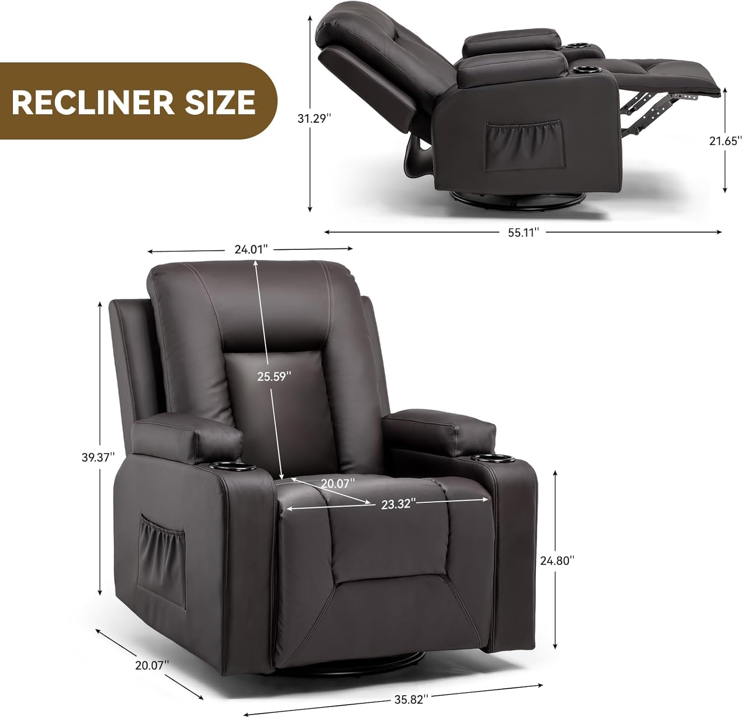 COMHOMA Recliner Chair, Swivel Rocker Recliners, Reclining Sofa with Side Pockets, Cup Holders for Living Room, Bedroom (Brown)