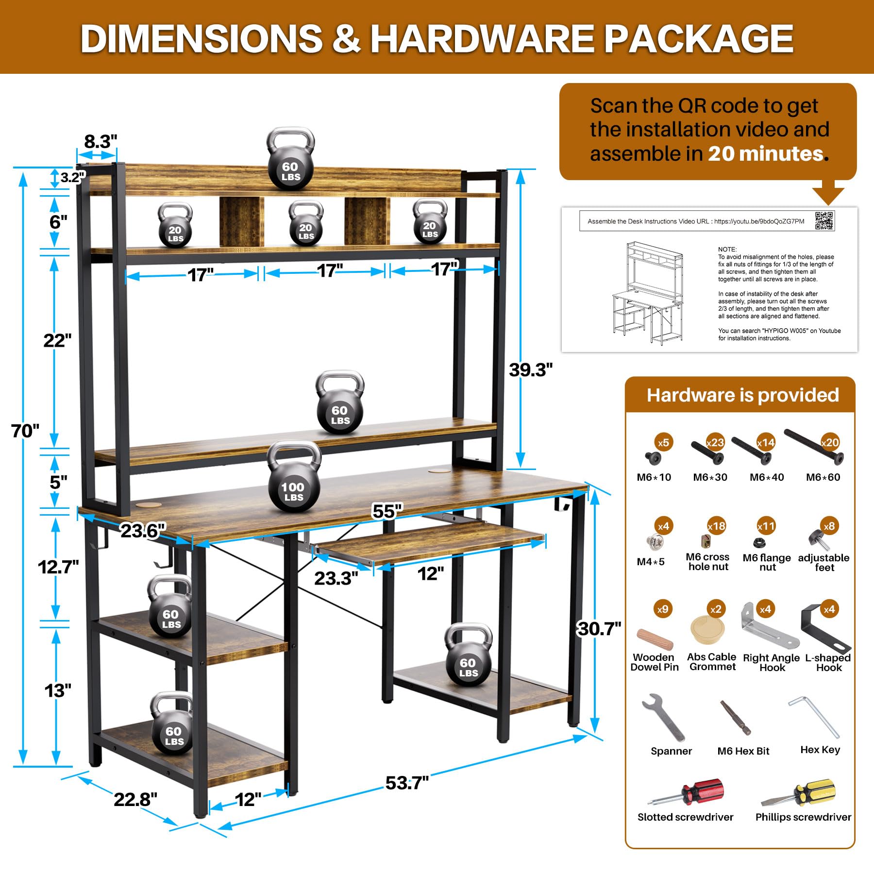 Heavy-duty computer desk with integrated hutch design, providing ample workspace and vertical storage for your home office setup. Features a convenient keyboard tray and multiple storage shelves to keep your workspace organized and efficient.