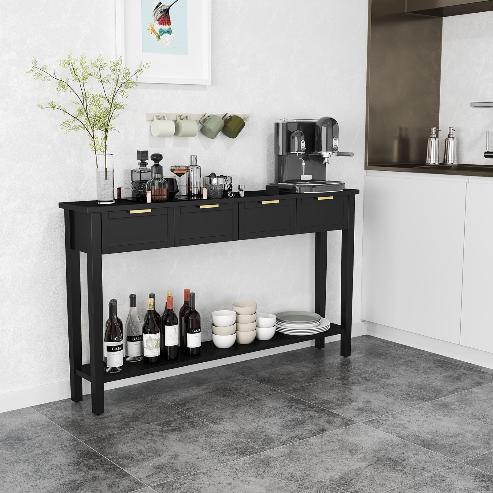 This elegant console table combines functionality with sophisticated design, perfect for entryways, hallways, or behind your couch. Featuring four spacious drawers and a lower shelf, this piece provides ample storage while maintaining a sleek profile.