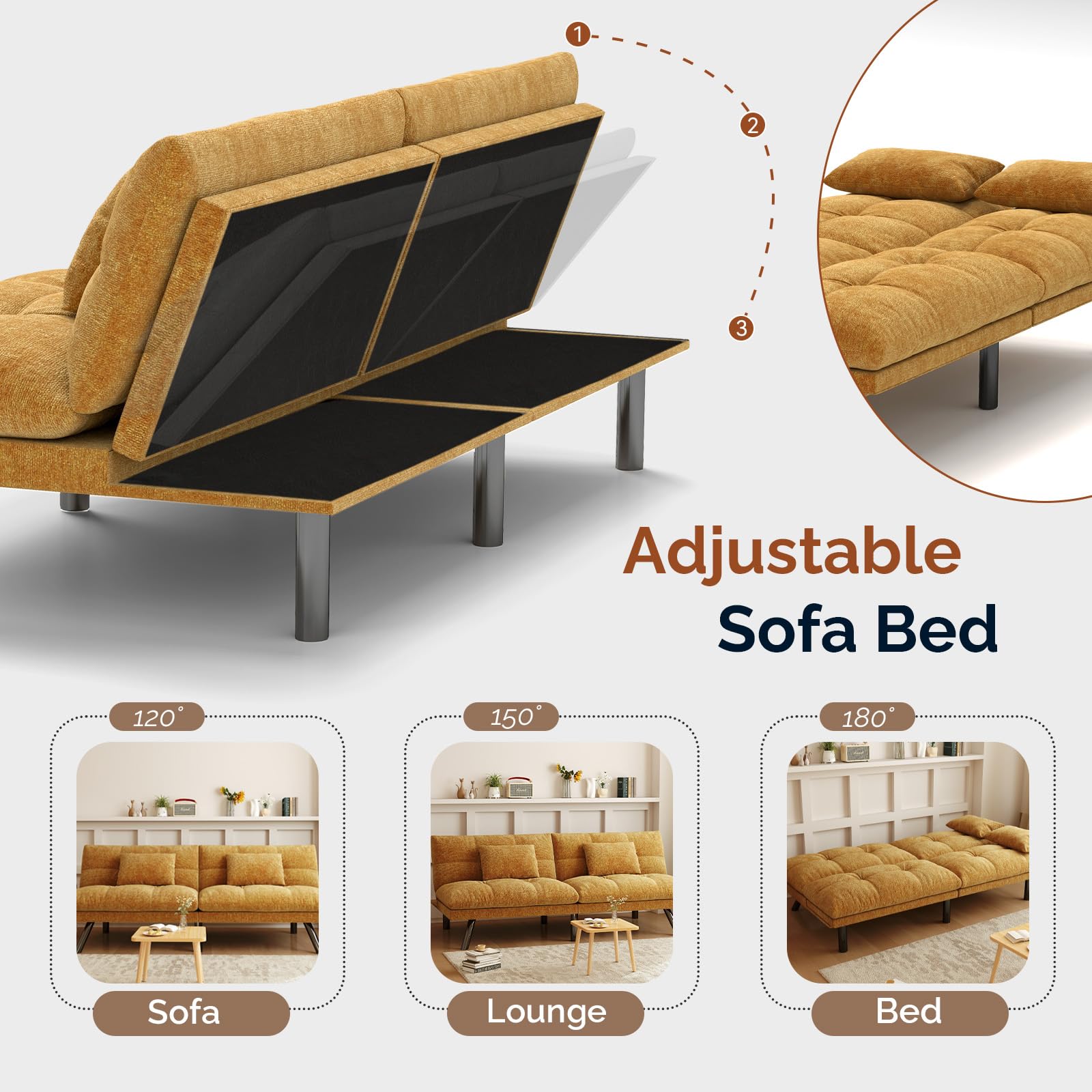 This convertible futon sofa bed offers versatile seating and sleeping solutions with premium chenille fabric construction. The adjustable backrest provides multiple configurations for ultimate comfort and functionality in any living space.