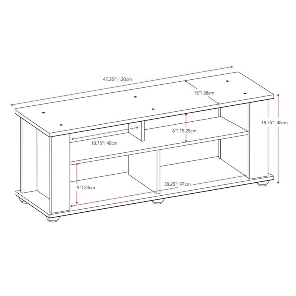 - Full length sound bar shelf (38.25" W x 15" D x 6" H) has a support half way back on shelf with 18.75" W on either side