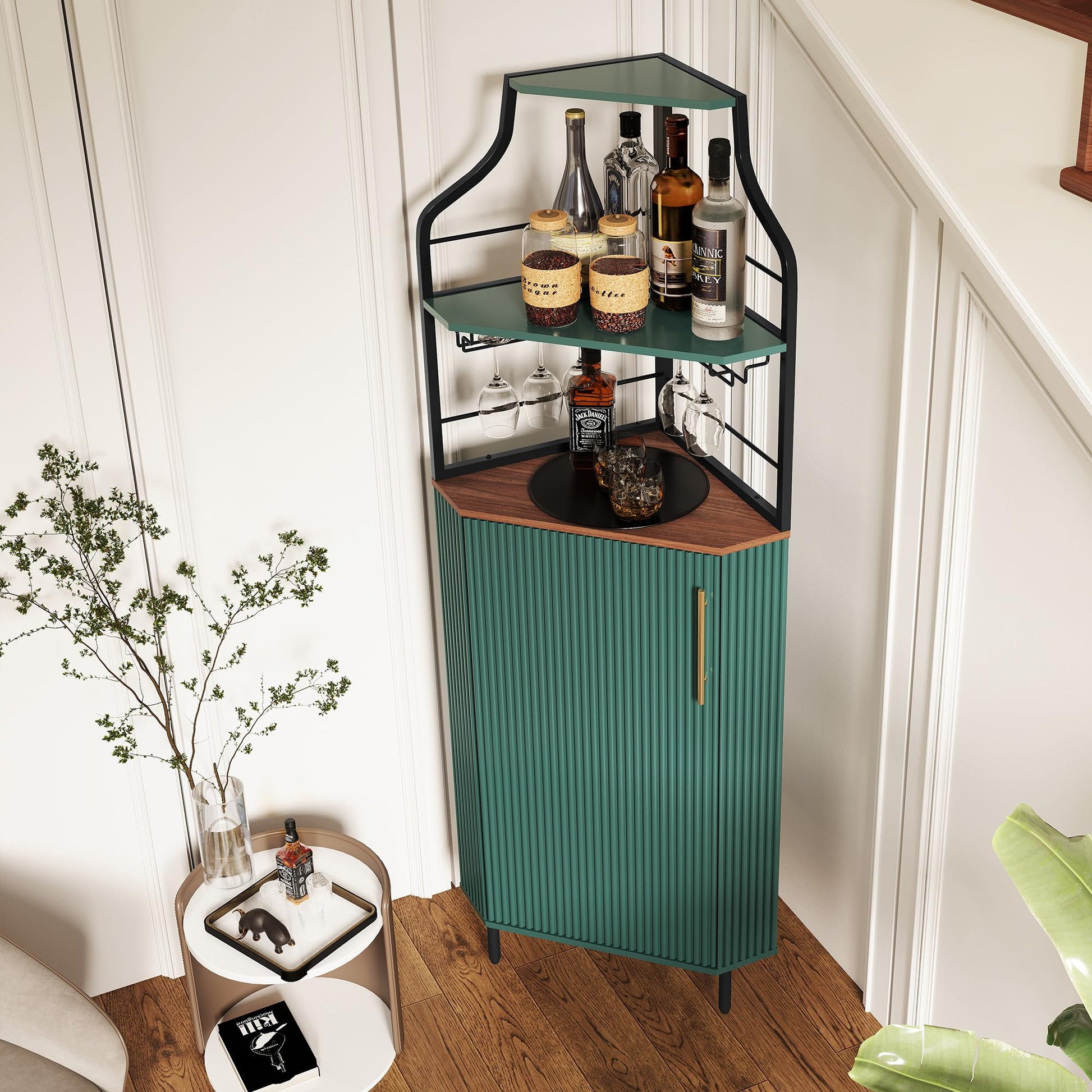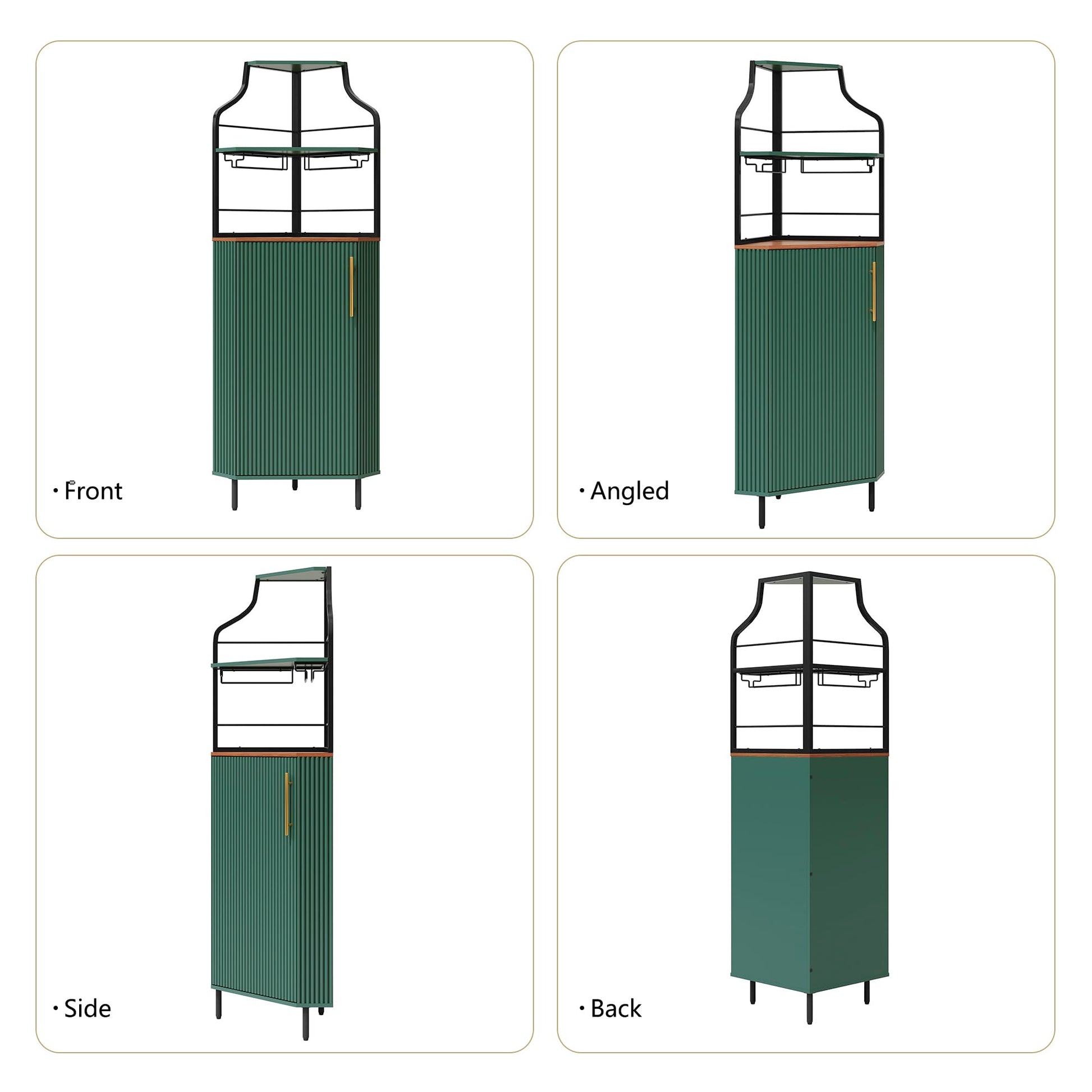 This modern corner bar cabinet combines functional storage with ambient LED lighting to create the perfect home bar solution. Designed to maximize corner spaces, this tall liquor cabinet features textured fluted wood doors and a moisture-resistant wooden top for lasting durability.