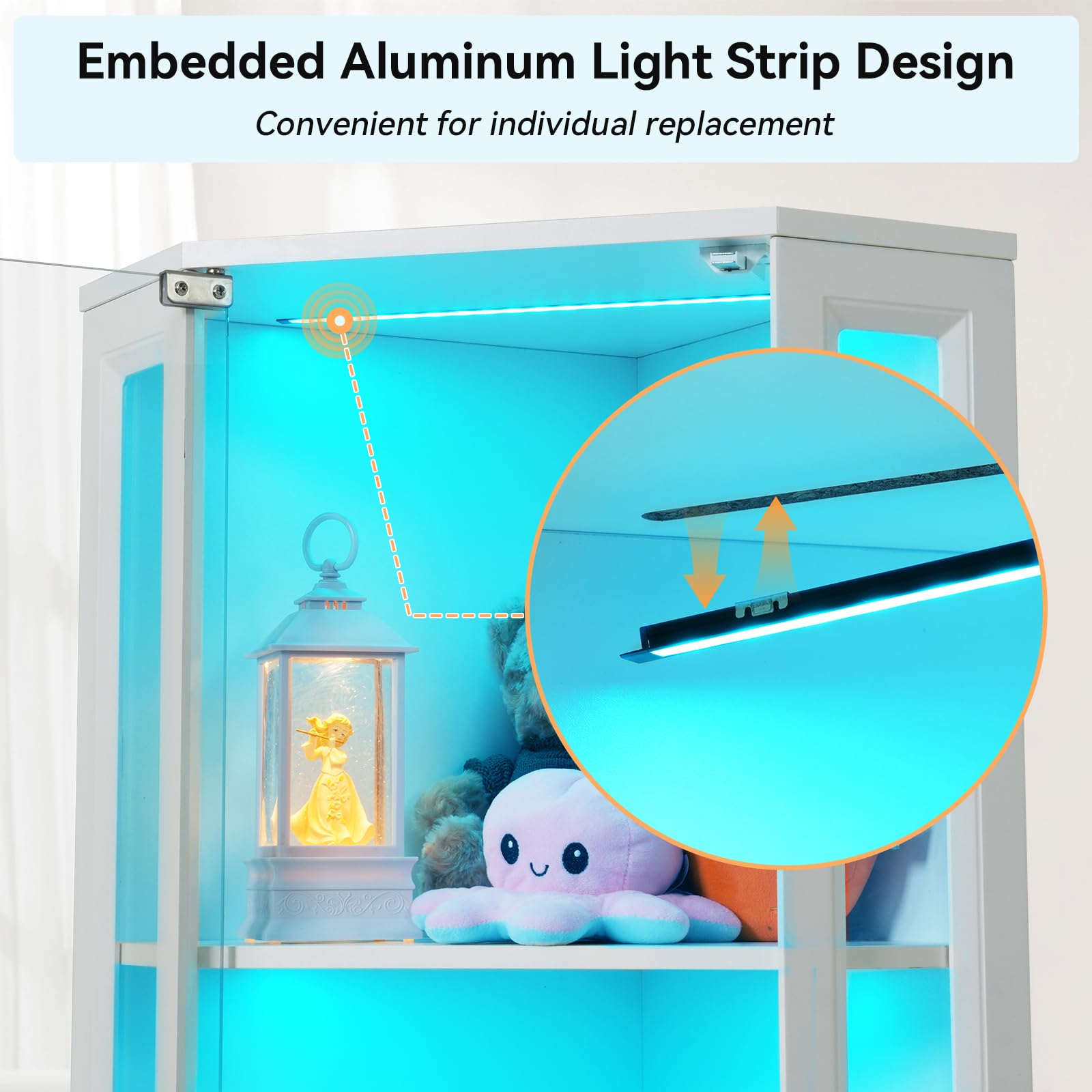 - Push-to-Open Glass Doors: Handle-less design with convenient push mechanism on both upper and lower doors. High-definition tempered glass protects collections from dust while providing clear visibility.