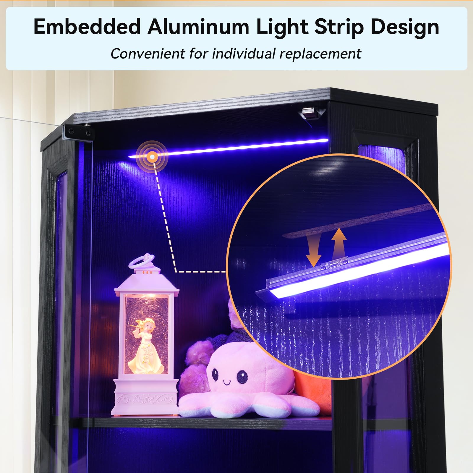- Push-to-Open Glass Doors: Handle-less design with easy-access mechanism. High-definition tempered glass resists deformation and fading while protecting collections from dust.