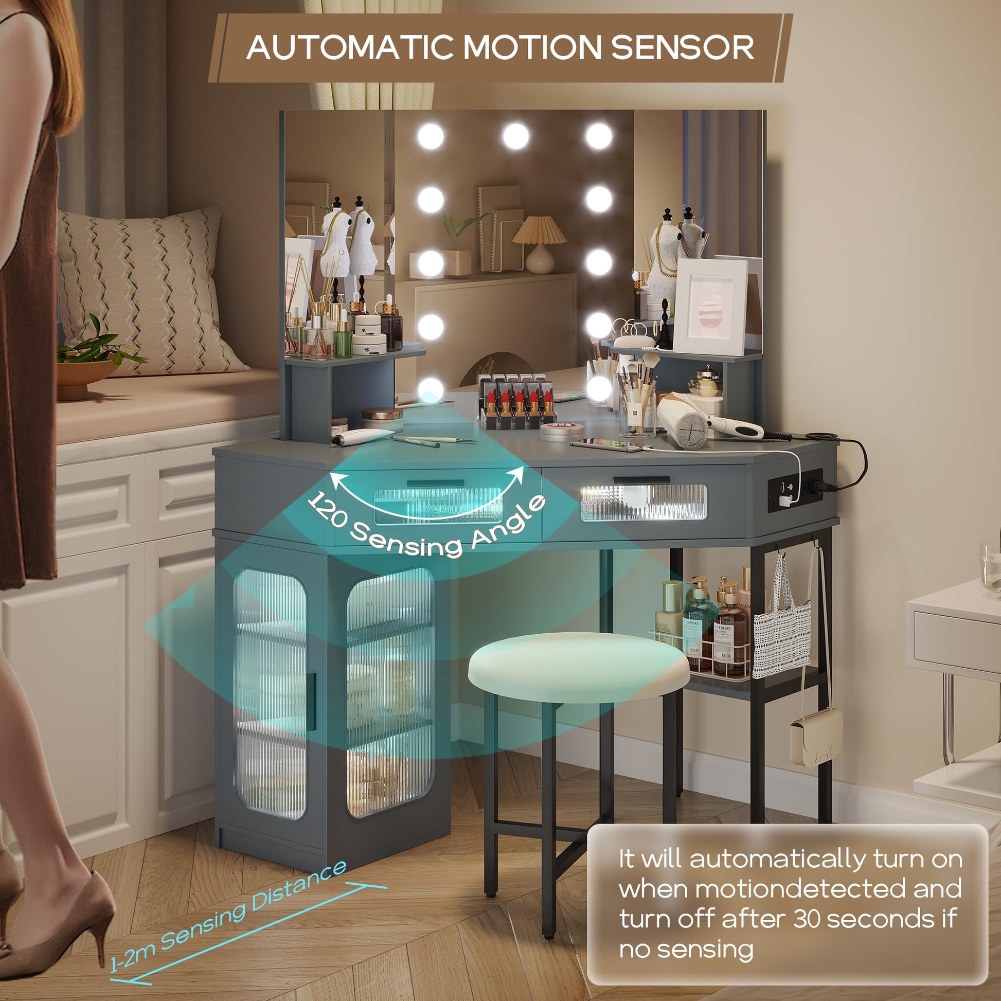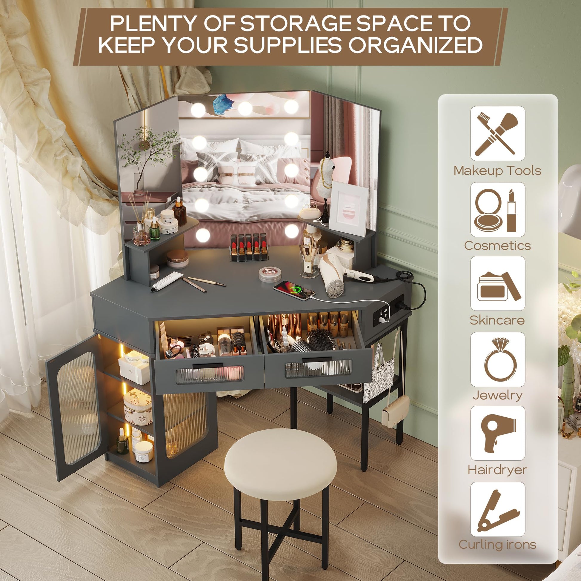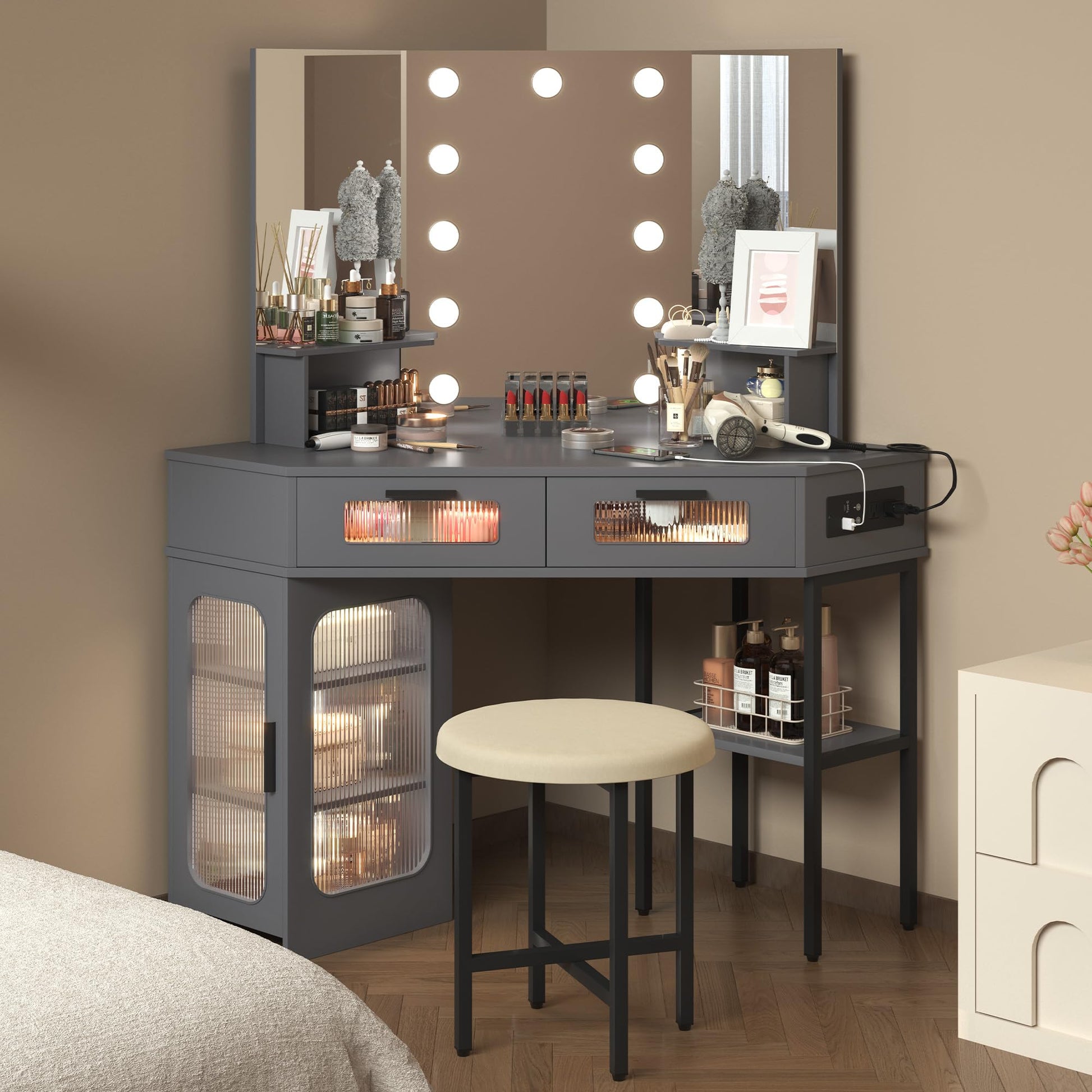 Corner Makeup Vanity Desk with Hollywood Mirror and Lights