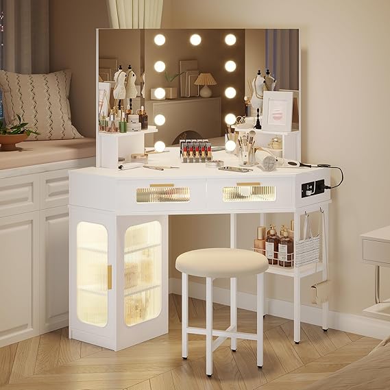 Transform your beauty routine with this elegant corner makeup vanity desk featuring a Hollywood-style lighted mirror. This space-saving design maximizes corner areas while providing ample storage and functionality for your daily makeup and grooming needs.