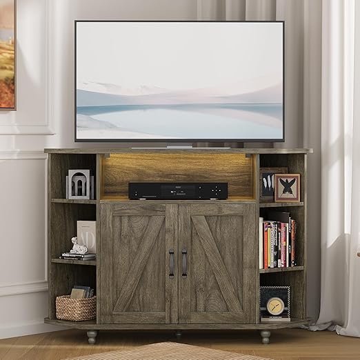 Transform your living space with this versatile corner entertainment center designed to maximize space while delivering modern functionality. Perfect for TVs up to 50 inches, this farmhouse-style TV cabinet combines practical storage with contemporary LED lighting.