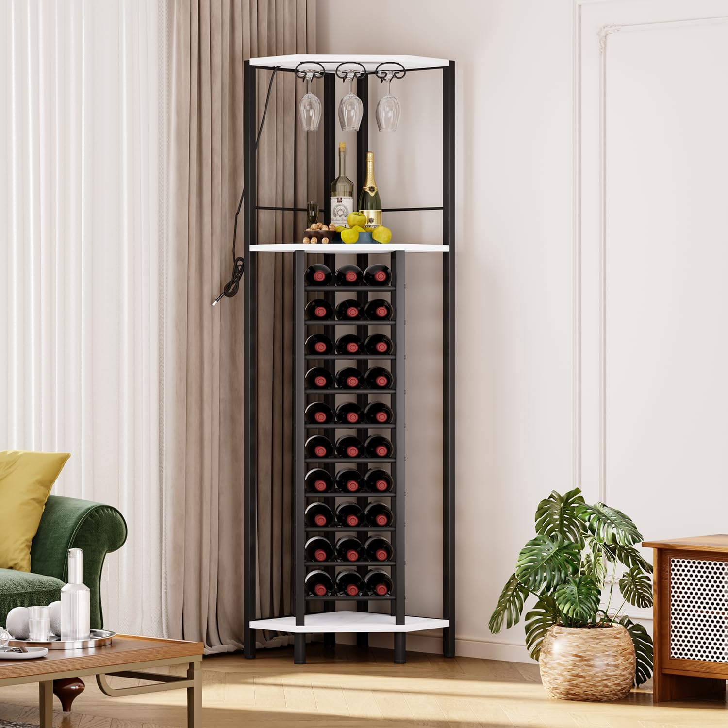This corner wine rack combines a glass holder, wine storage, and display shelves to meet your different storage needs. The wine rack shelf features white marble wood grain finish, creating a noble and elegant look suitable for modern home styles.