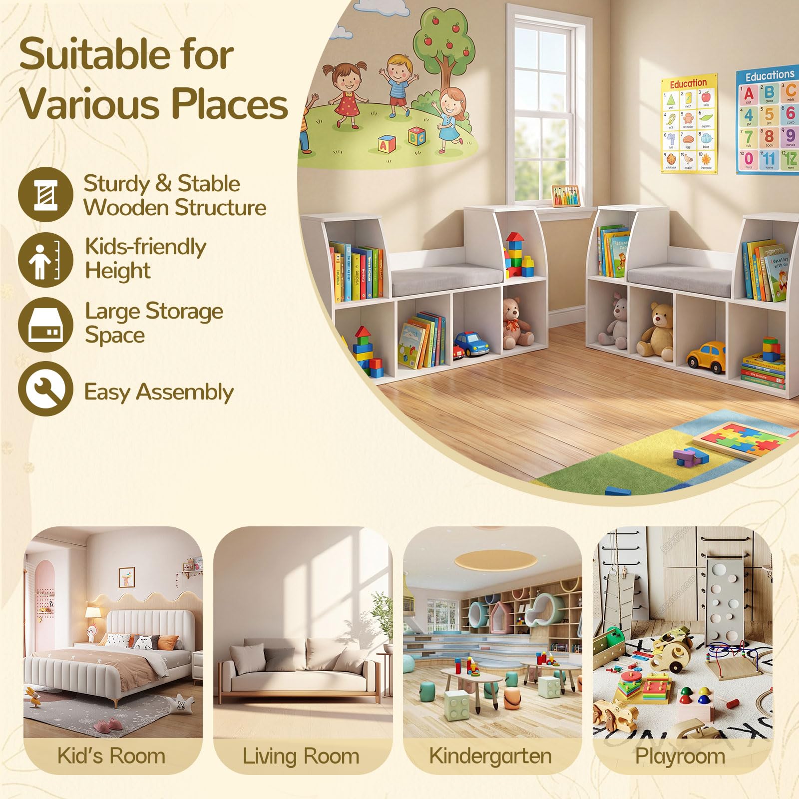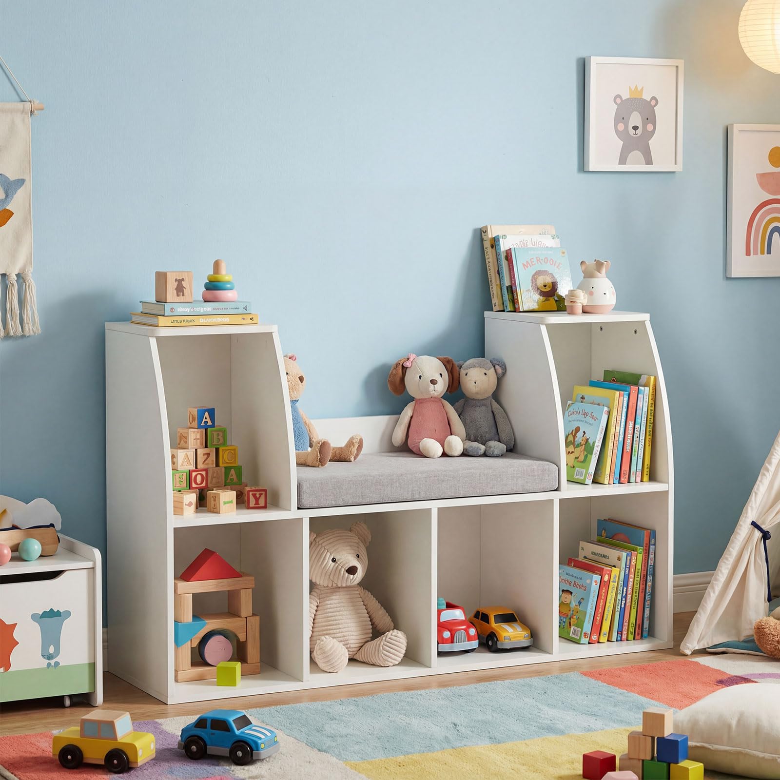 - Multifunctional Use: Combining the functions of a bookcase and a bench, this reading nook works great in the entryways, kids rooms, or cubby closet as an extra seating at home. And its modern and cute style will be perfect for nursery, daycare, classroom and so on.