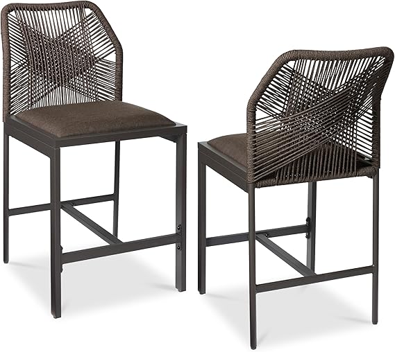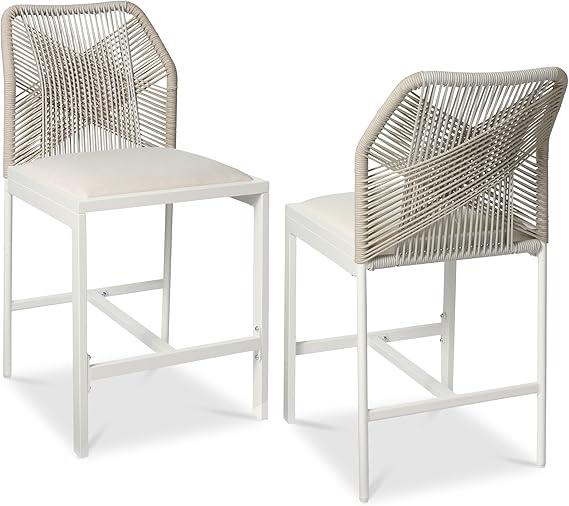 Elevate your seating experience with these contemporary counter height bar stools, designed for both indoor and outdoor use. Featuring a unique woven rope backrest with ergonomic lumbar support and integrated plush cushioning, these stools combine style with exceptional comfort.