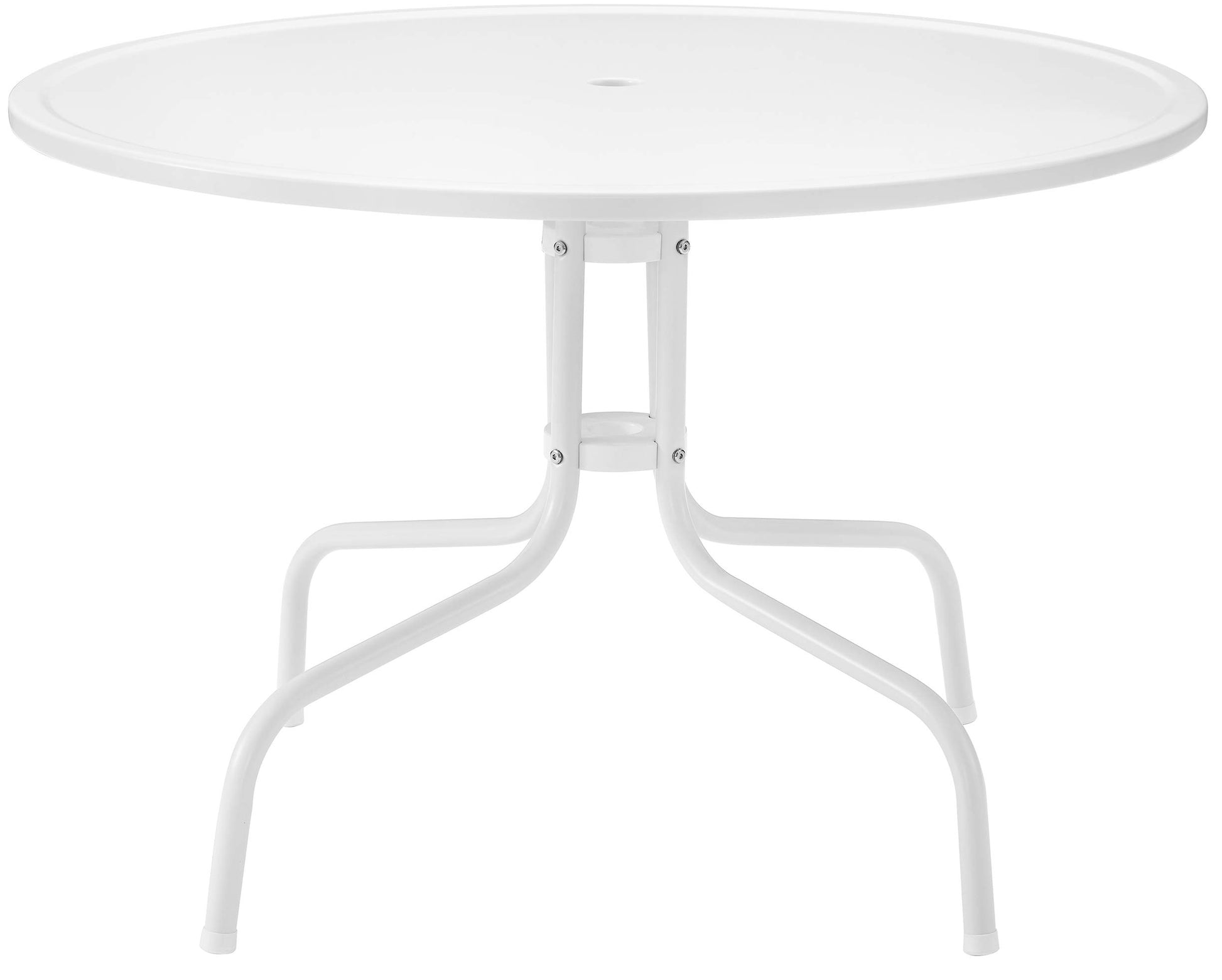 - OUTDOOR PATIO FURNITURE: The round dining table features a white satin finish and a pedestal base. Great for a small patio or deck, this set includes four chairs (22"W x 28.2"D x 33.25"H) and a dining table (39"W x 39"D x 25.63"H).