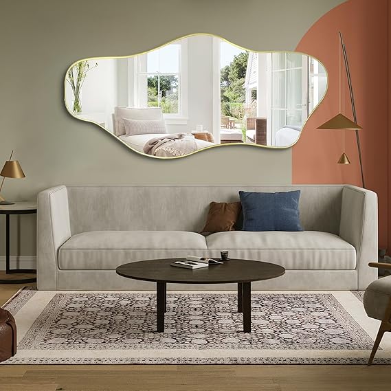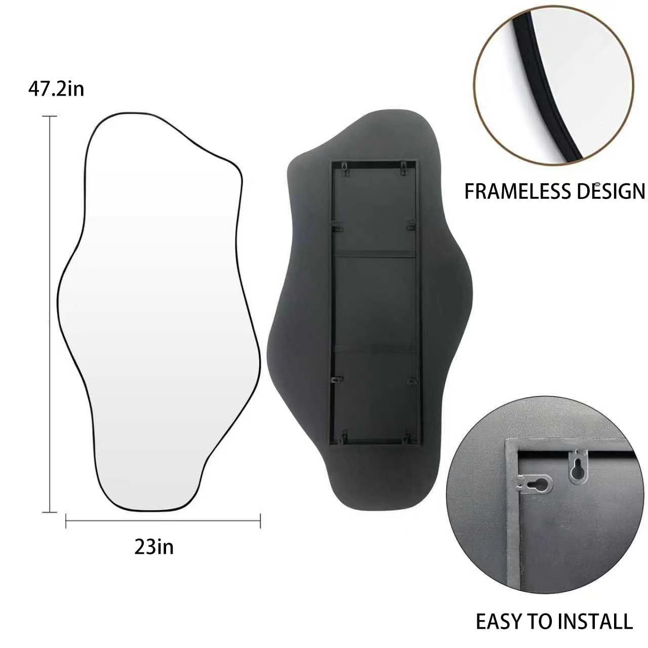 - Various Size: Irregular frameless mirror are available in 40"x17.7", 47"x22", 51.1"x23.6", 59"x25.5". With an ultra-thin painting frame, this mirror is both functional and stylish