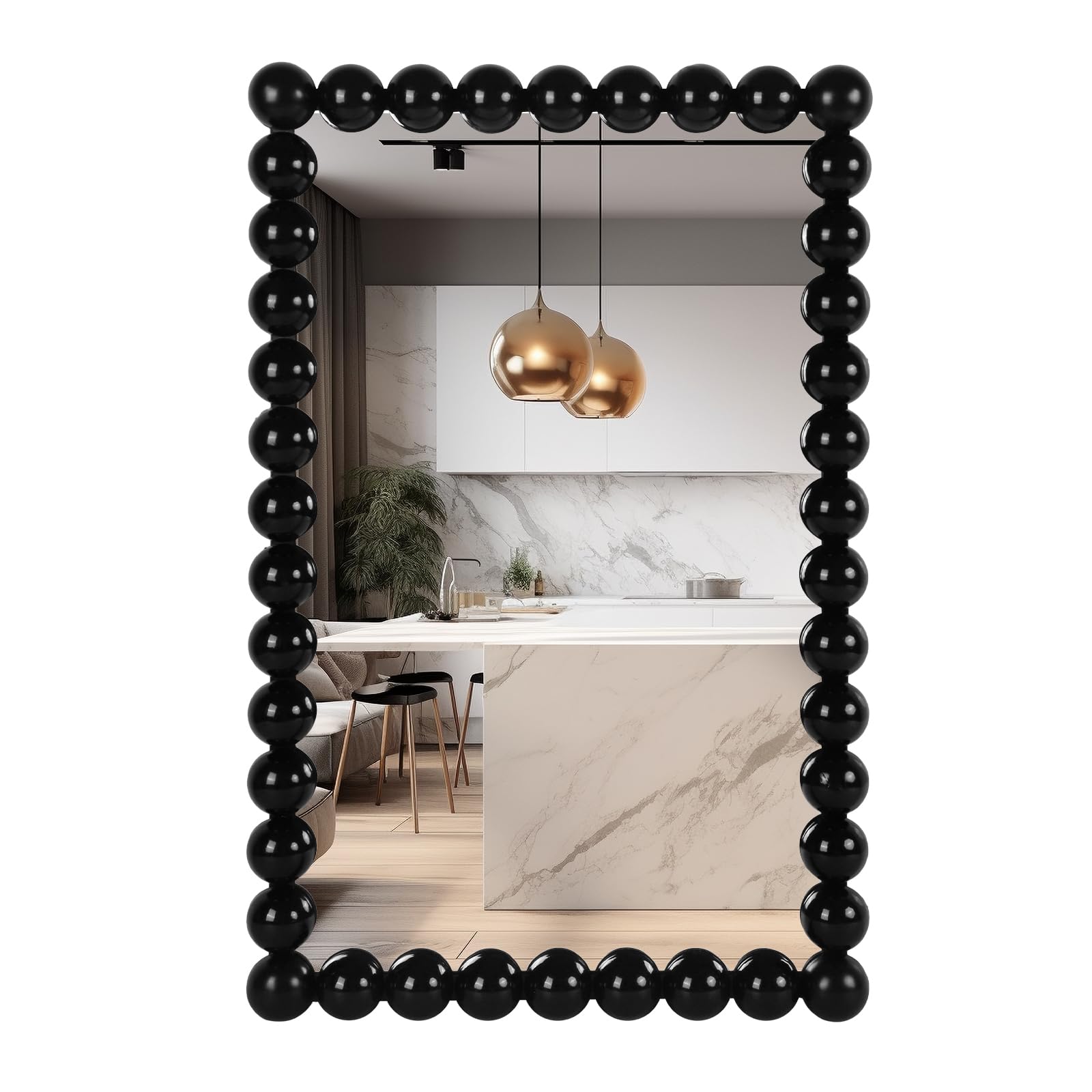 Enhance your space with this stunning decorative wall mirror featuring a unique beaded frame and ornate detailing. This rectangular mirror offers a modern look with clean, straight lines that reflects light beautifully, serving as a large statement piece or subtle accent to complement your décor.
