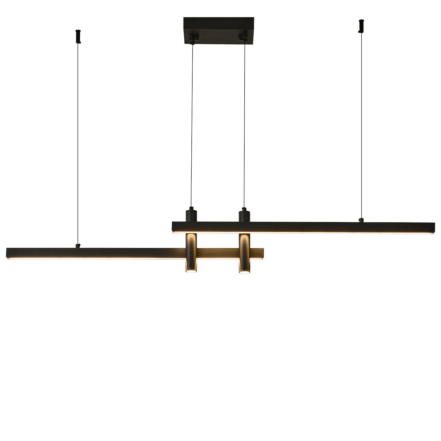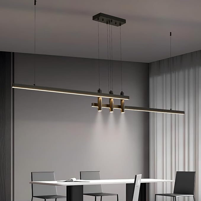 Modern linear pendant light featuring adjustable brightness and color temperature control via remote. Perfect for kitchen islands, dining rooms, pool tables, and home offices.