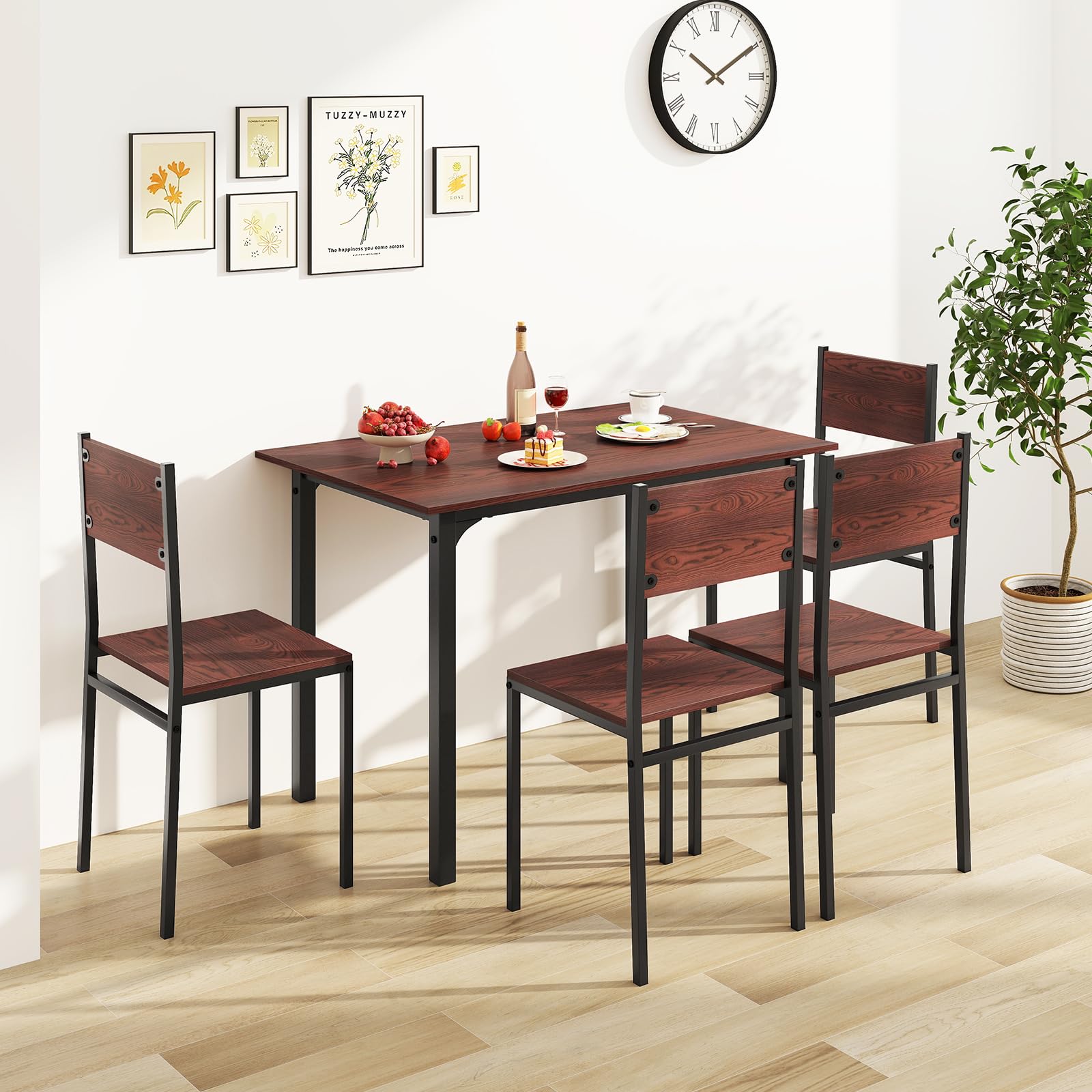 Transform your dining space with this elegant 4-piece dining set. Featuring a spacious table and four matching chairs, this set combines contemporary design with practical functionality. The rich walnut finish adds warmth and sophistication to any kitchen, dining room, or breakfast nook.