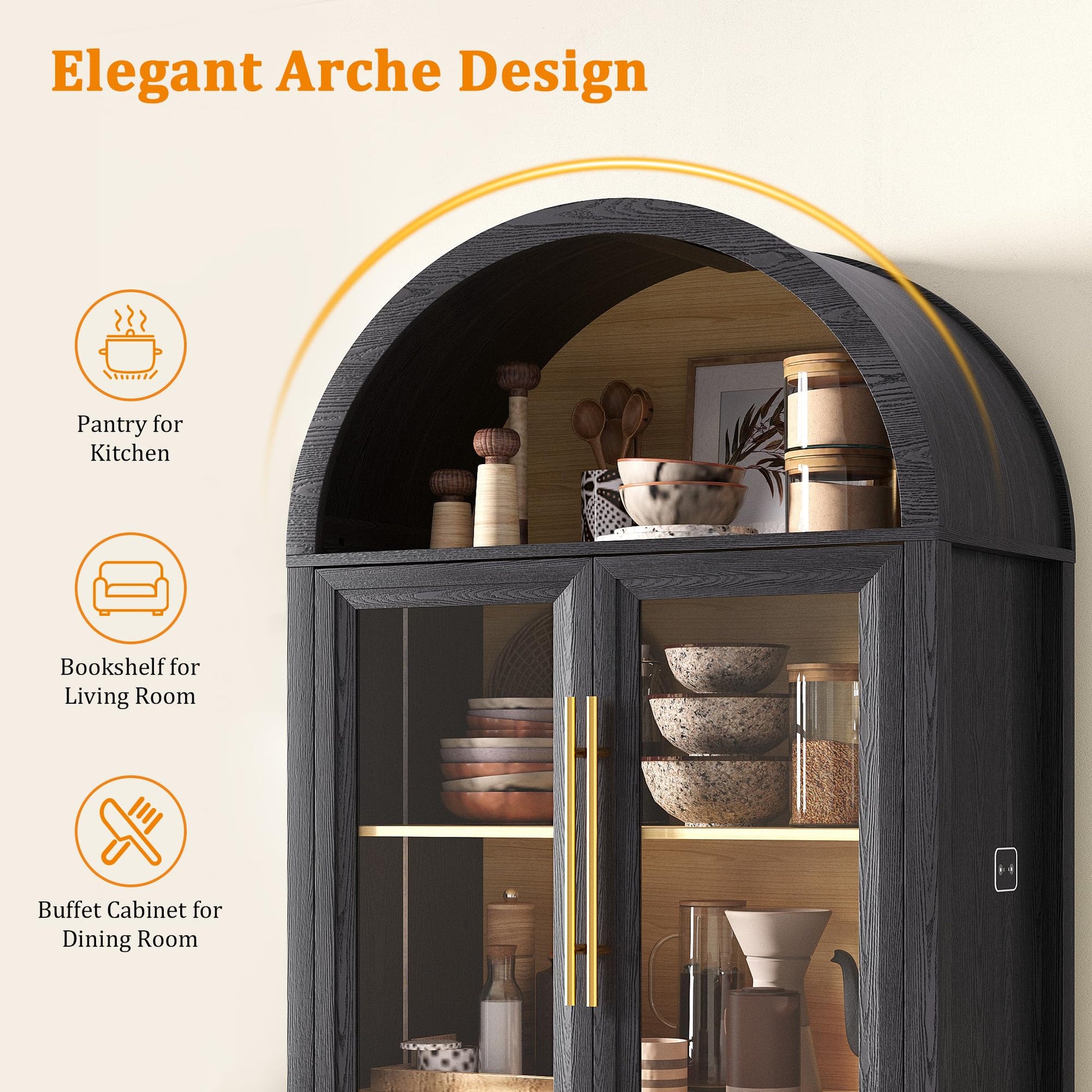 Elegant 5-tier arched bookcase designed to showcase your collectibles, decorative items, and treasured possessions. This tall storage cabinet features transparent glass doors that provide full visibility while protecting your displays from dust.