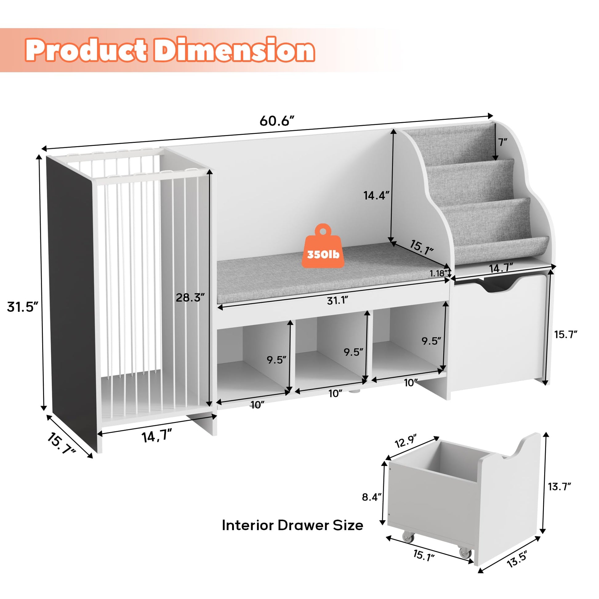 DTK Kids Reading Nook with Bench,Toy Storage Organizer with Stuffed Animals Holder,Kids Bookshelf with Seat Cushion,3 Storage Cubbies and Toy Box on Wheels for Playroom,Bedroom,Nursery,White