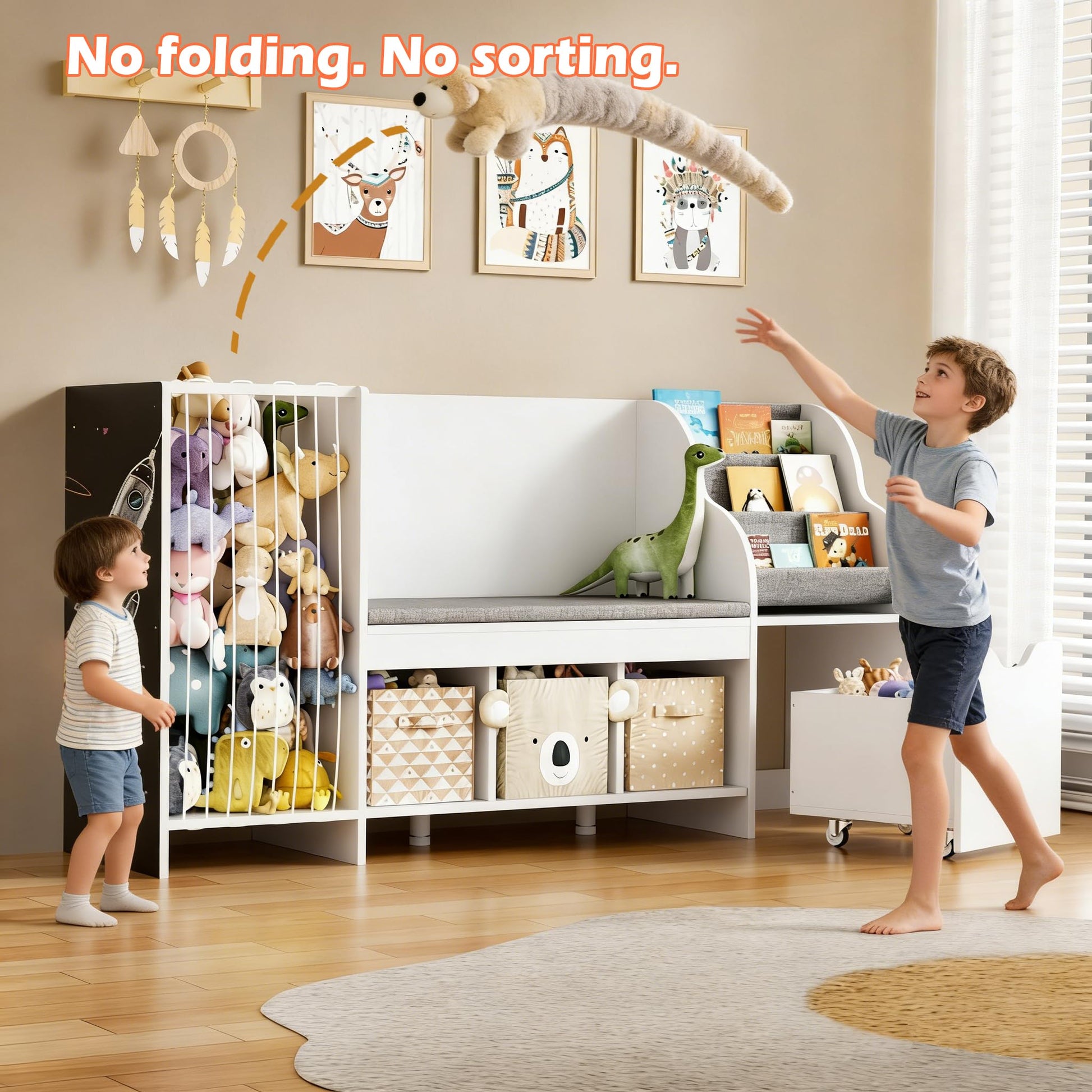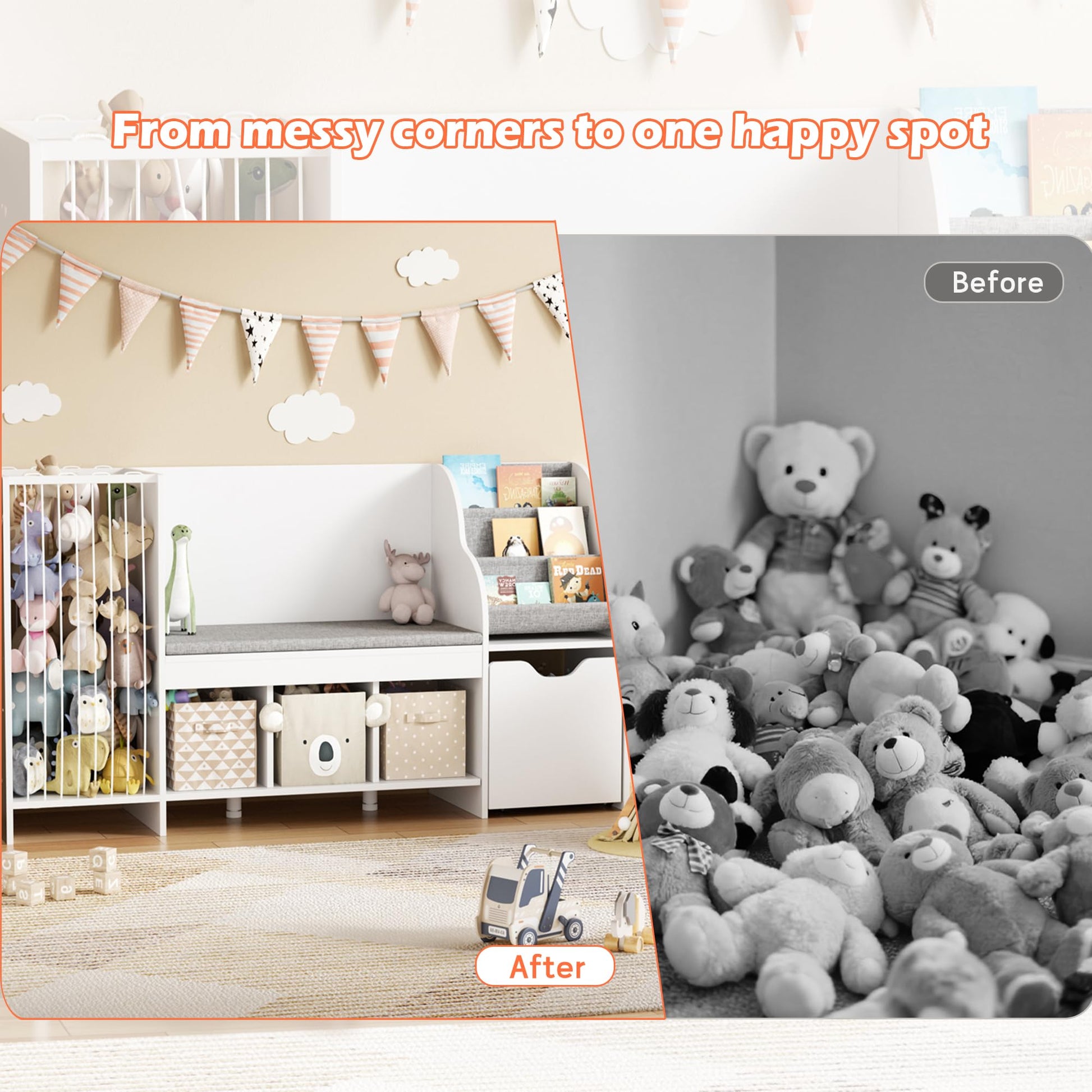 - Easy Plush Toy Storage: The open stuffed animal storage with elastic cords lets kids toss toys in without sorting or folding. A kid-friendly solution that makes clean-up simple and keeps plush toys off the floor and within reach.