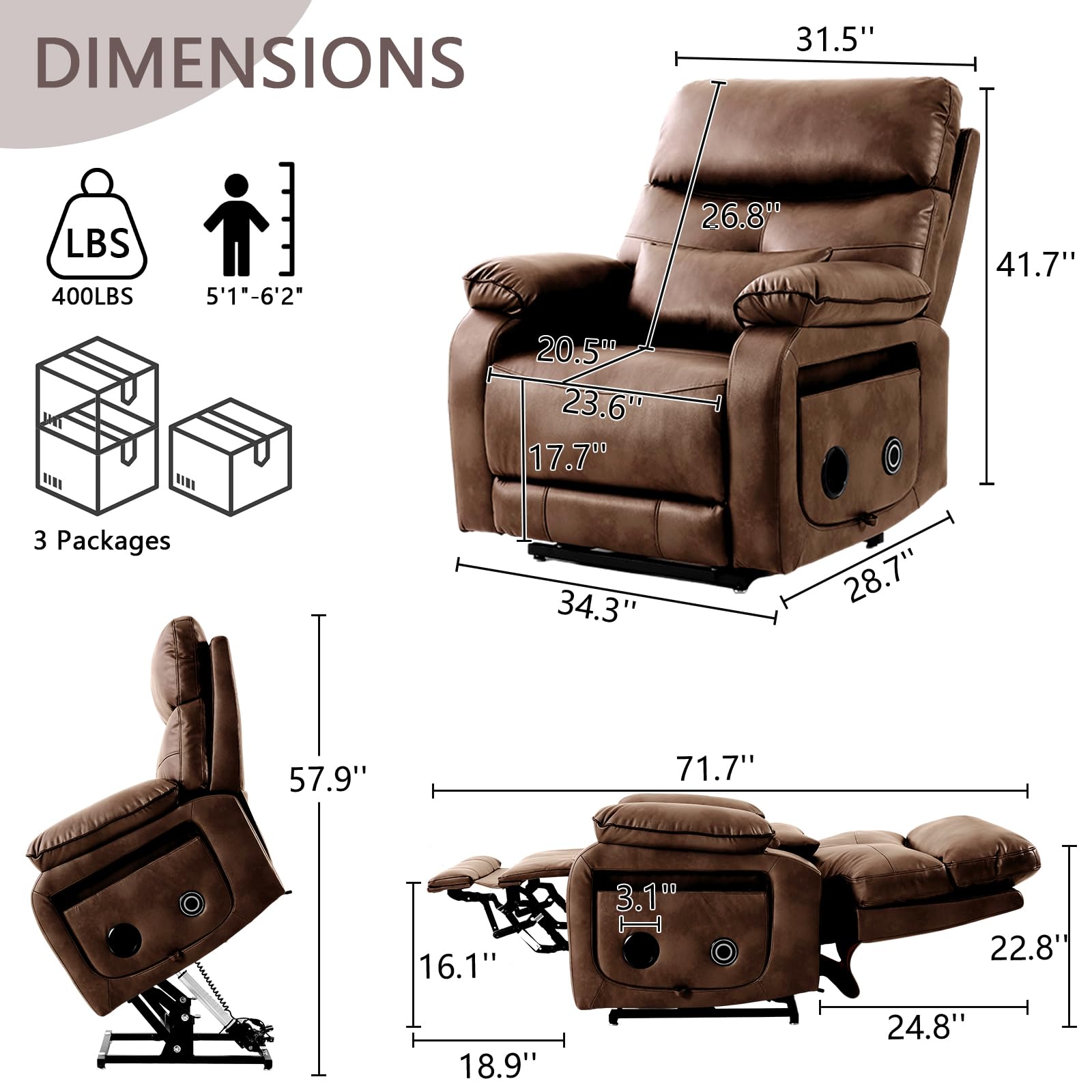 - 【High-Quality Materials】This power lift chair for elderly features soft, breathable leather that’s easy to clean, and high-density foam for long-lasting comfort. The sturdy iron and solid wood frame can support up to 400 lbs, with a formaldehyde-free wooden frame made of FSC-Certified wood, ensuring safety and durability for long-term use