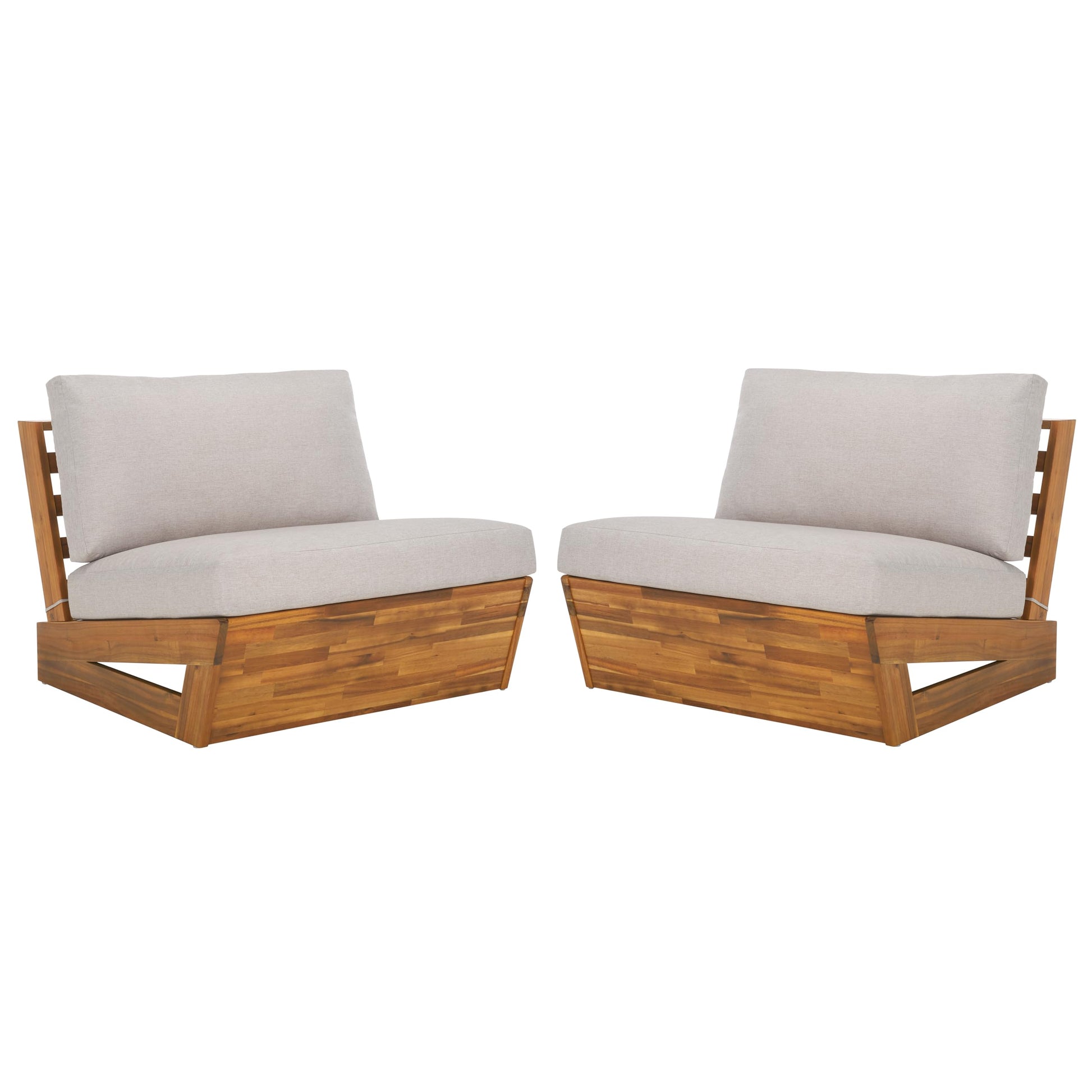 Elevate your outdoor living space with this modern lounge chair set. Crafted from solid wood with a natural finish, these chairs feature plush light grey cushions designed for ultimate comfort and relaxation. The contemporary silhouette and clean lines complement any patio, deck, or garden setting.