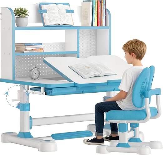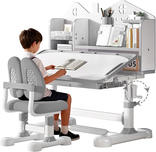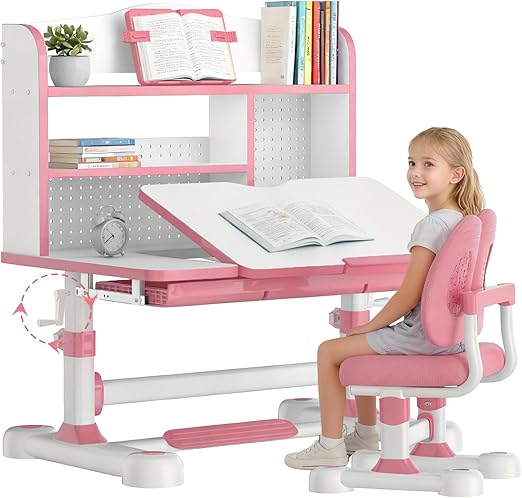 This ergonomic study desk and chair set is designed for growing children ages 3-12, featuring height-adjustable components and a tiltable desktop for optimal comfort during homework, reading, and creative activities.