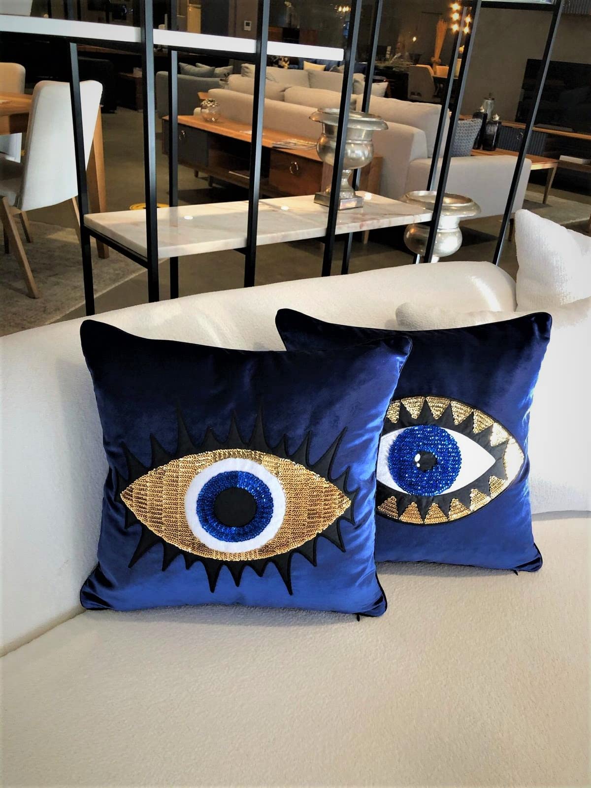 Transform your living space with these luxurious evil eye throw pillow covers featuring a protective amulet design in midnight blue velvet. These modern decorative cushion covers bring both style and symbolic protection to your home.