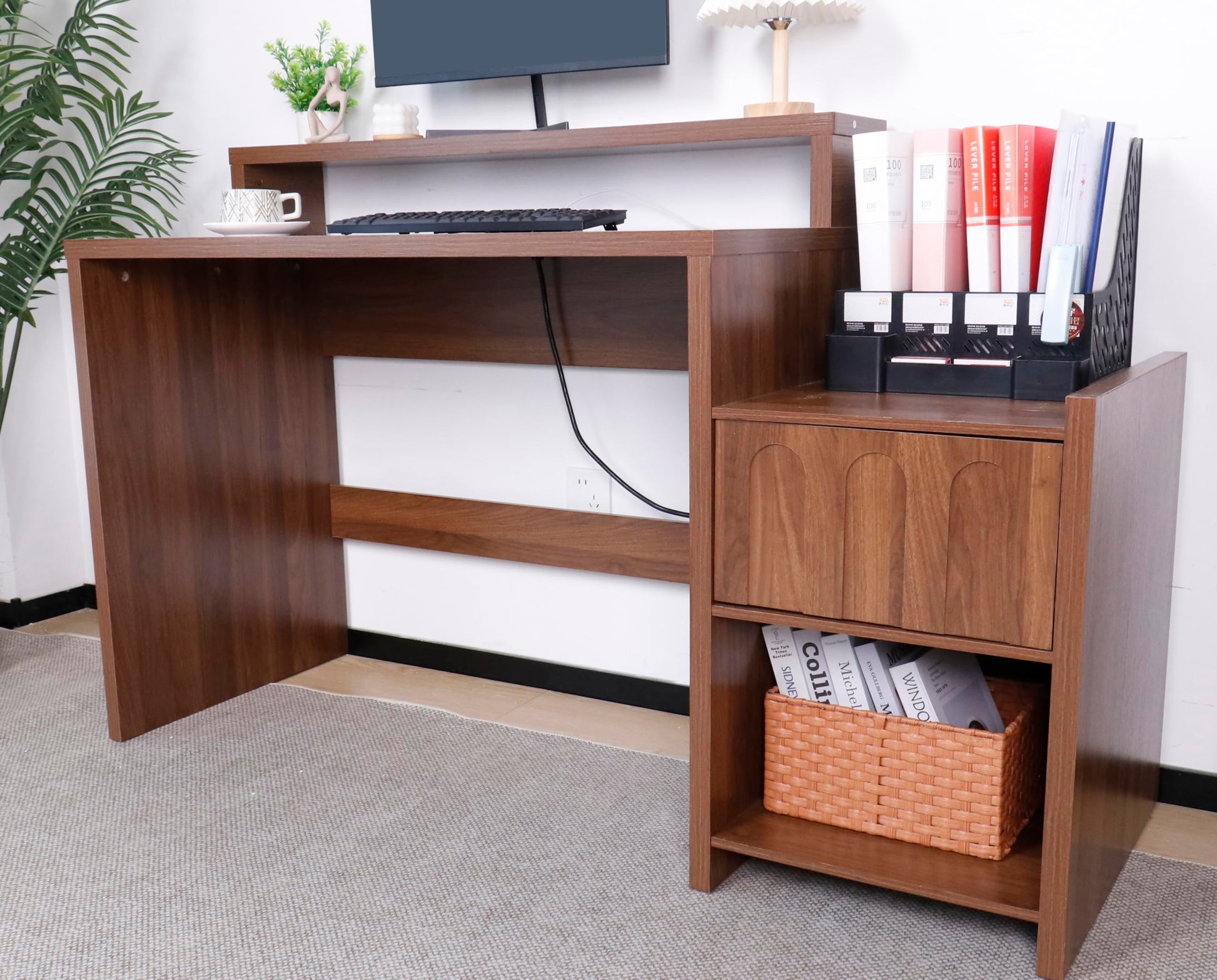 This all-in-one multifunctional computer desk combines workspace efficiency with smart storage solutions. Featuring a spacious desktop, monitor stand, storage drawer, open shelf, built-in power socket, and dedicated printer stand, it creates a complete workstation for home or office use.