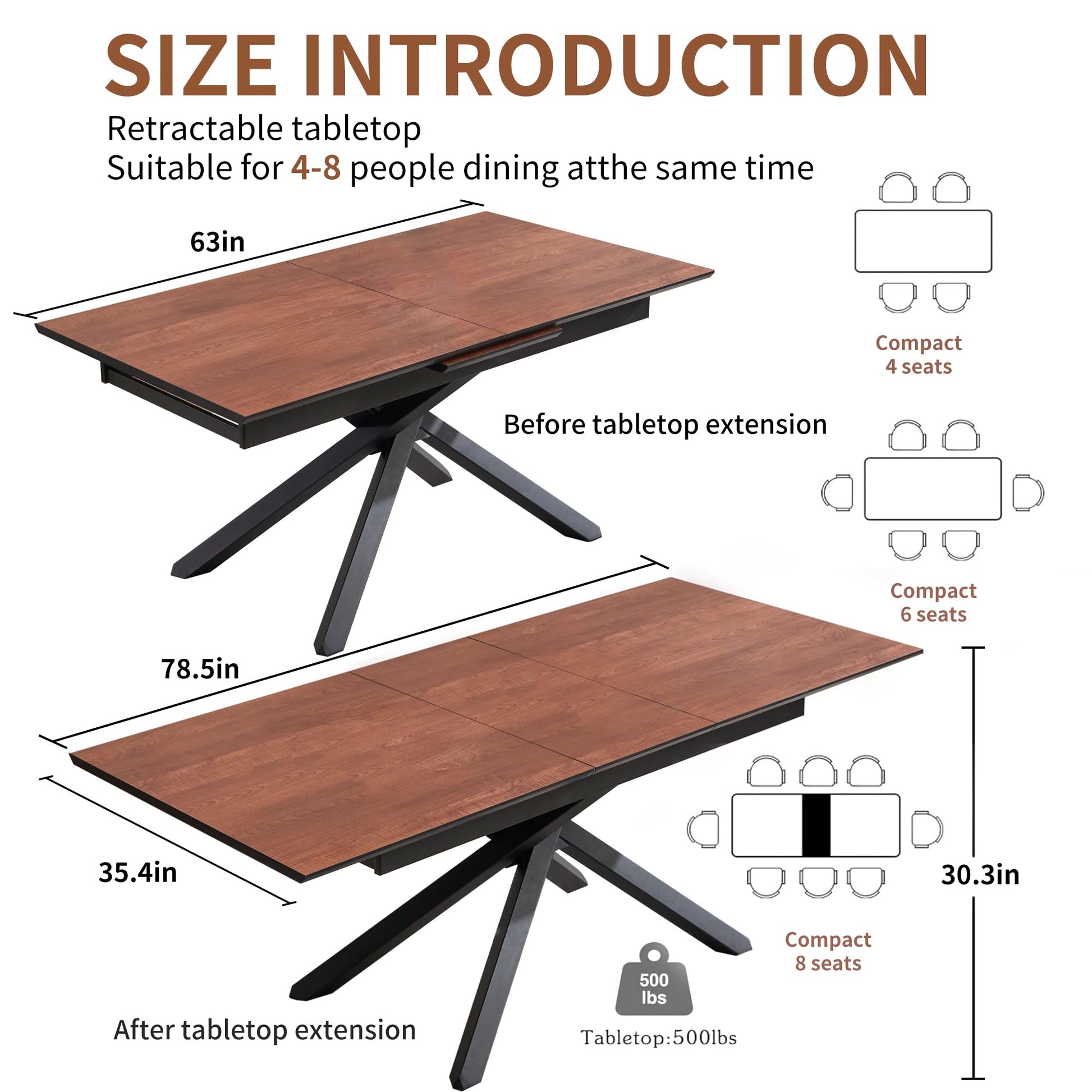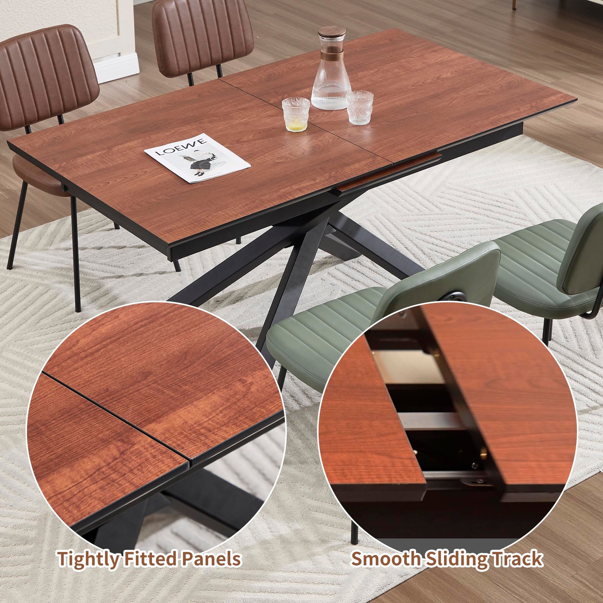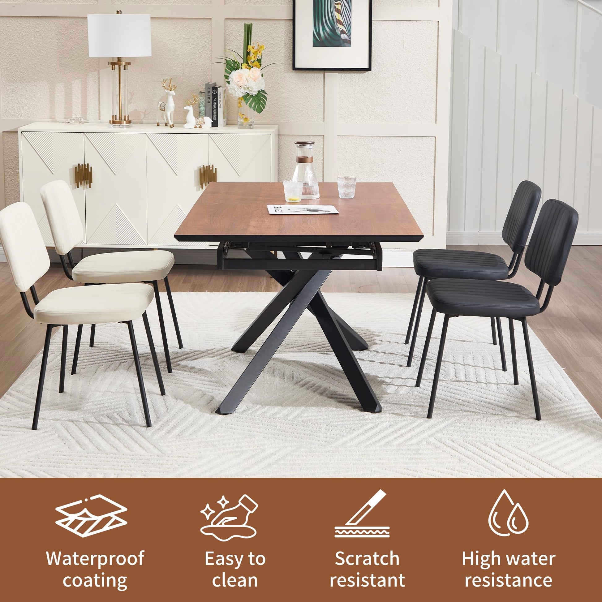 This expandable dining table features an innovative retractable design with smooth, silent rails for quick and easy expansion. The compact design extends from 63 inches to 78.7 inches, comfortably accommodating 6-10 people. The extension panel hides beneath the tabletop, saving space while maintaining a stylish appearance.