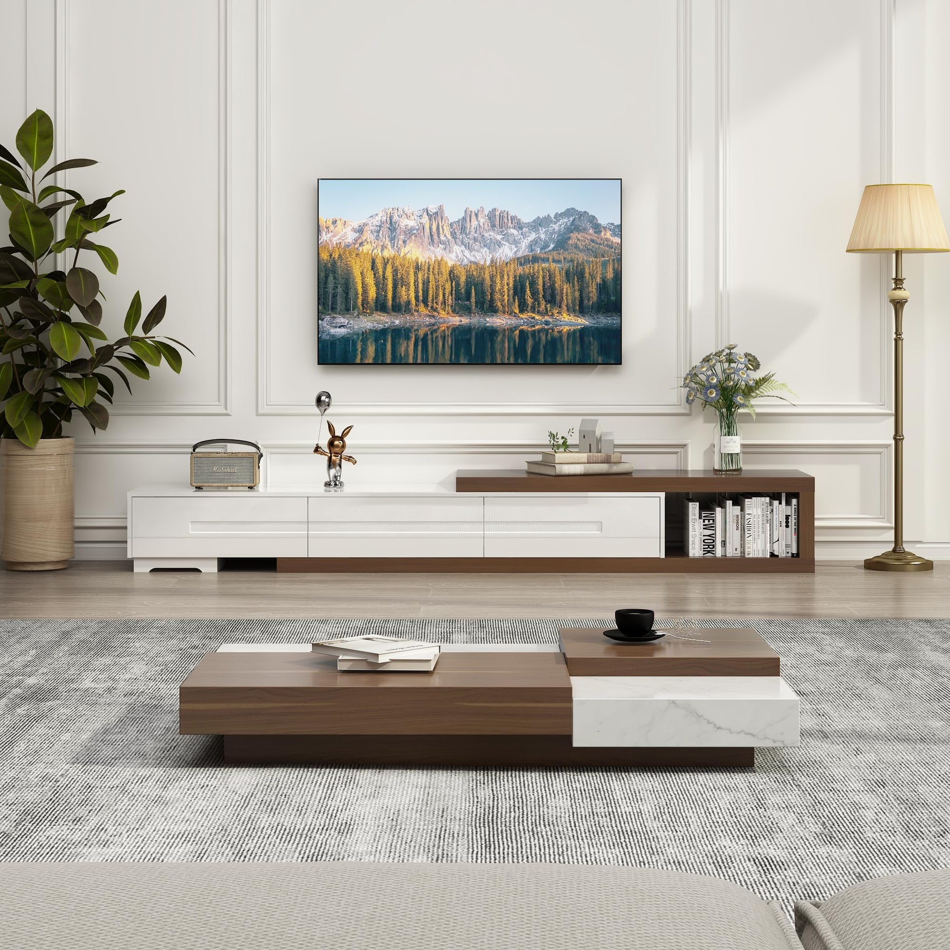Modern entertainment center featuring extendable design to accommodate TVs from 82 to 120 inches. This wood media console offers reversible configuration with three spacious drawers for organized storage. Perfect for living rooms and bedrooms seeking functional, contemporary furniture.