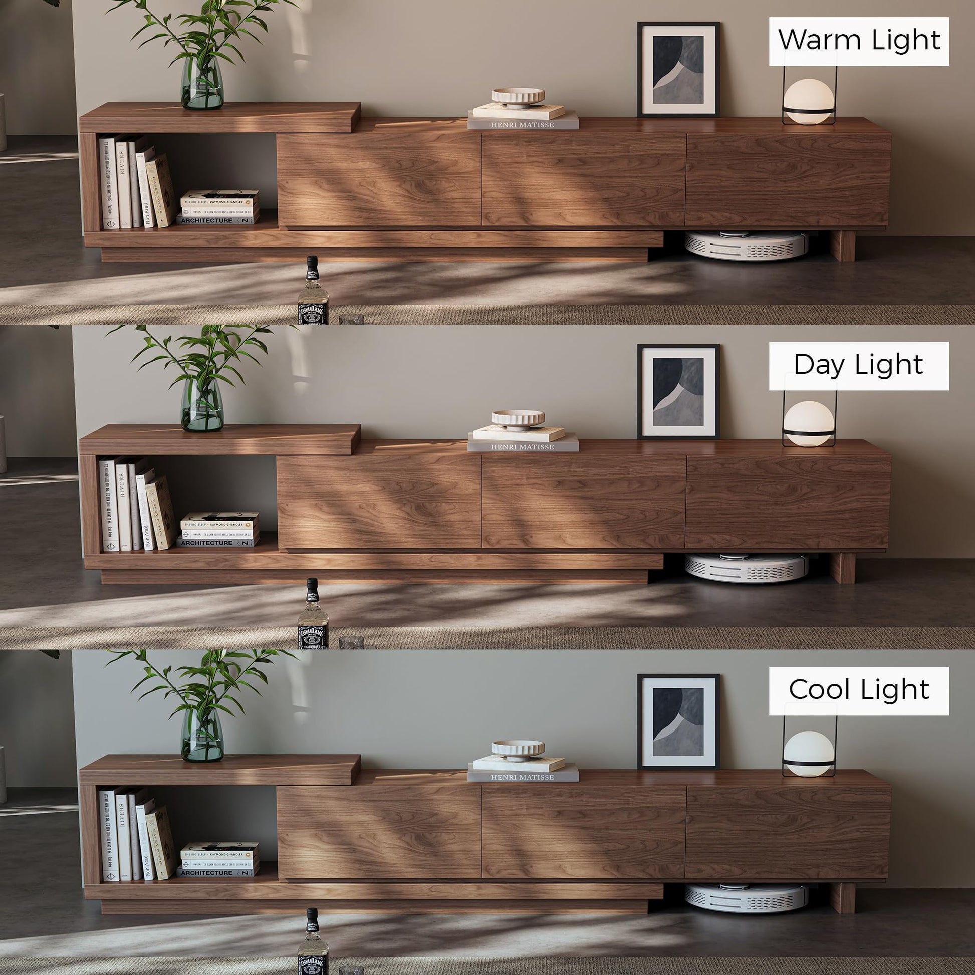 The entertainment console combines smart storage solutions with a warm walnut finish. It features one open compartment ideal for displaying books or décor, paired with three spacious drawers to keep electronics and accessories neatly organized and out of sight. The walnut brown wood grain finish blends seamlessly with both light and dark interiors, enhancing mid-century, modern, or transitional spaces.