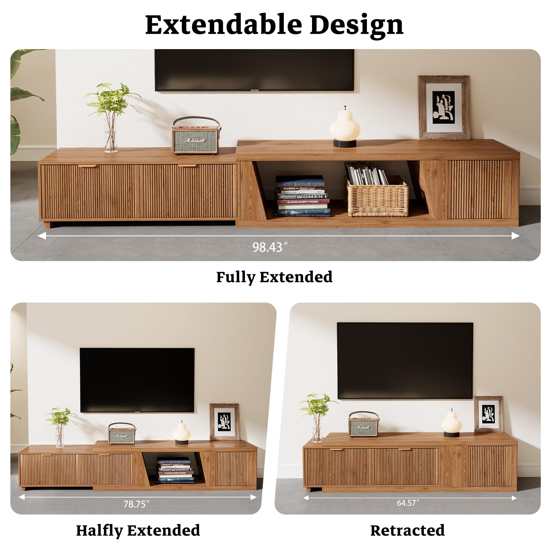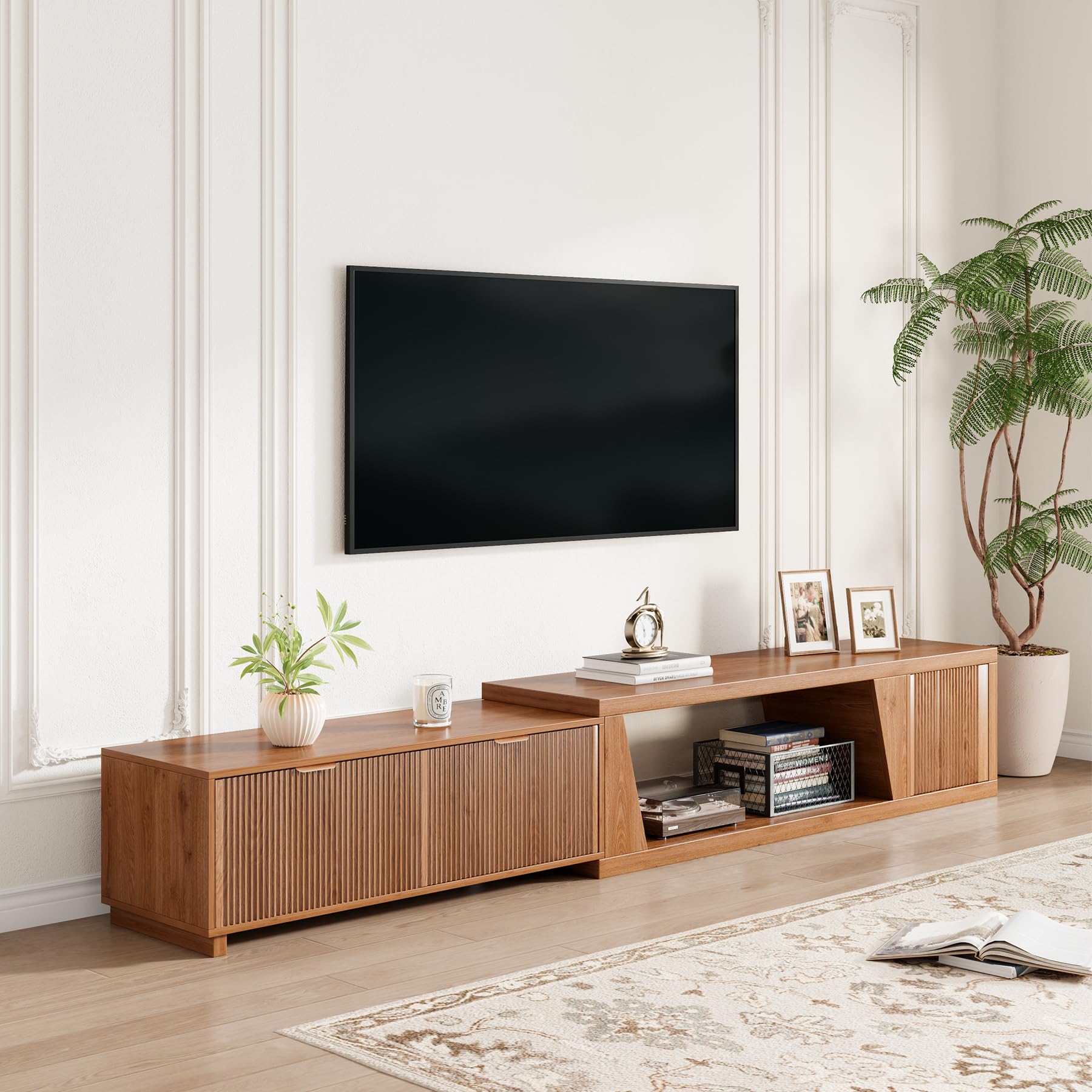 This mid-century modern TV stand combines functionality with elegant design, featuring an extendable structure that adapts to your space and storage needs. The warm brown oak finish with fluted details adds sophisticated texture to any living room.