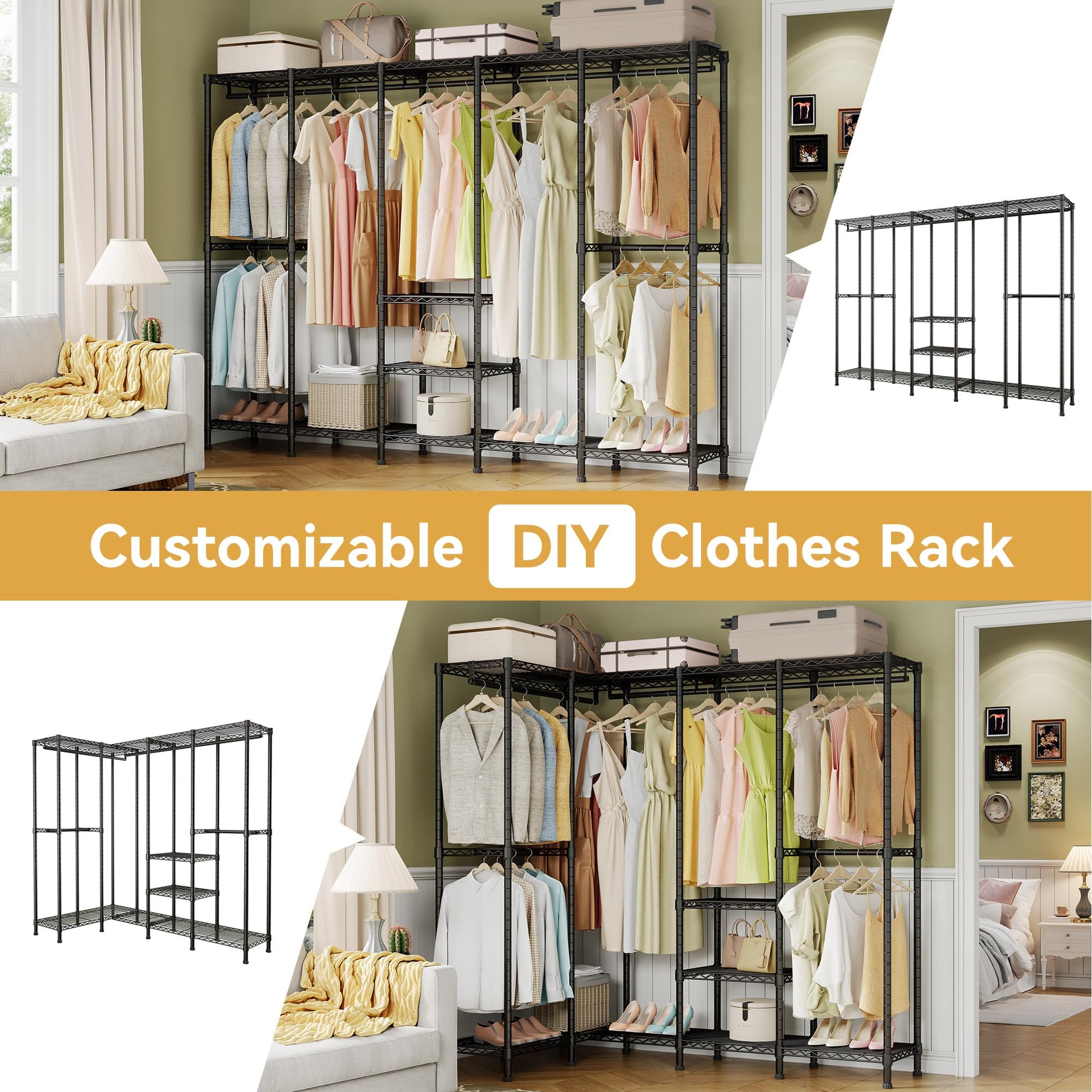- Flexible installation options: configure as L-shape for corners or straight-line for walk-in closets and retail displays