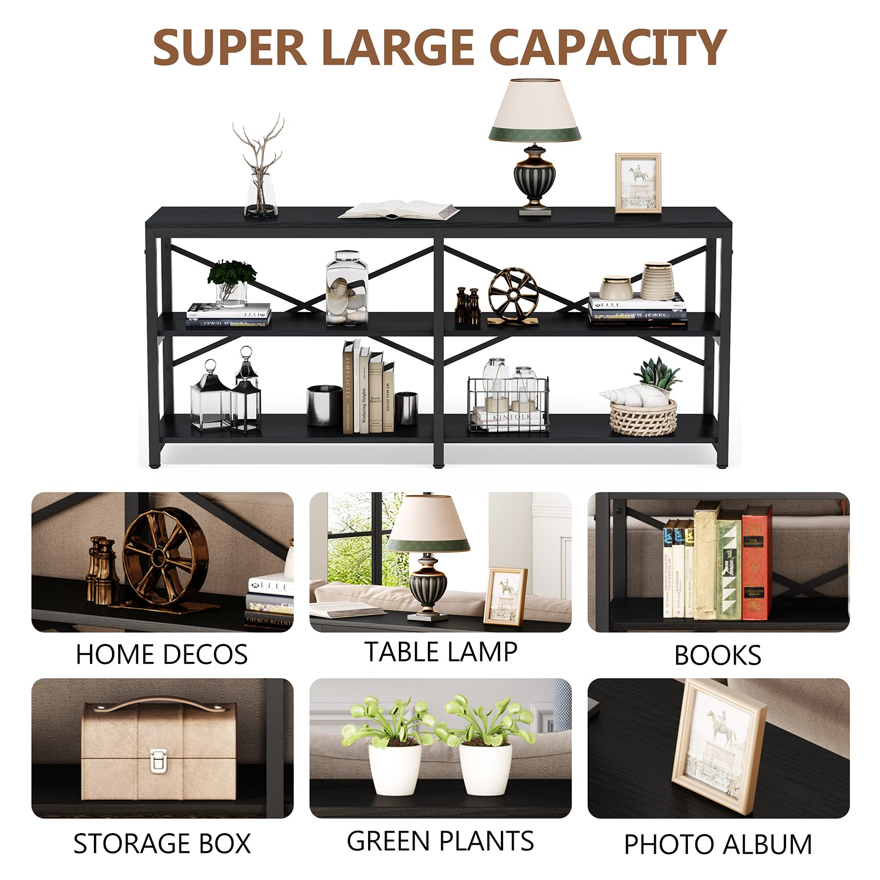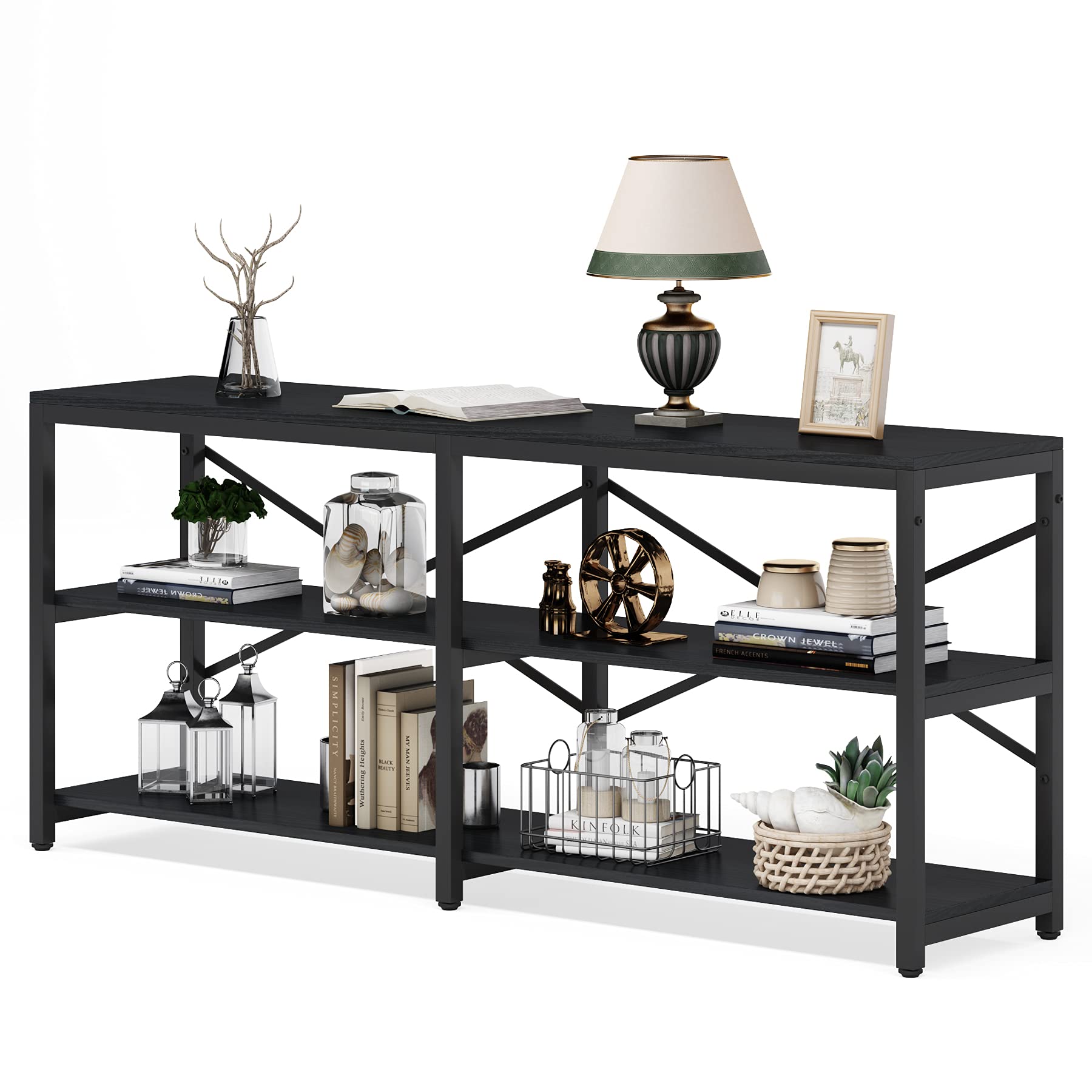 This modern industrial console table combines functionality with contemporary design, perfect for living rooms, hallways, and entryways. The extra-long design provides ample surface space while the 3-tier storage shelves offer versatile organization options.