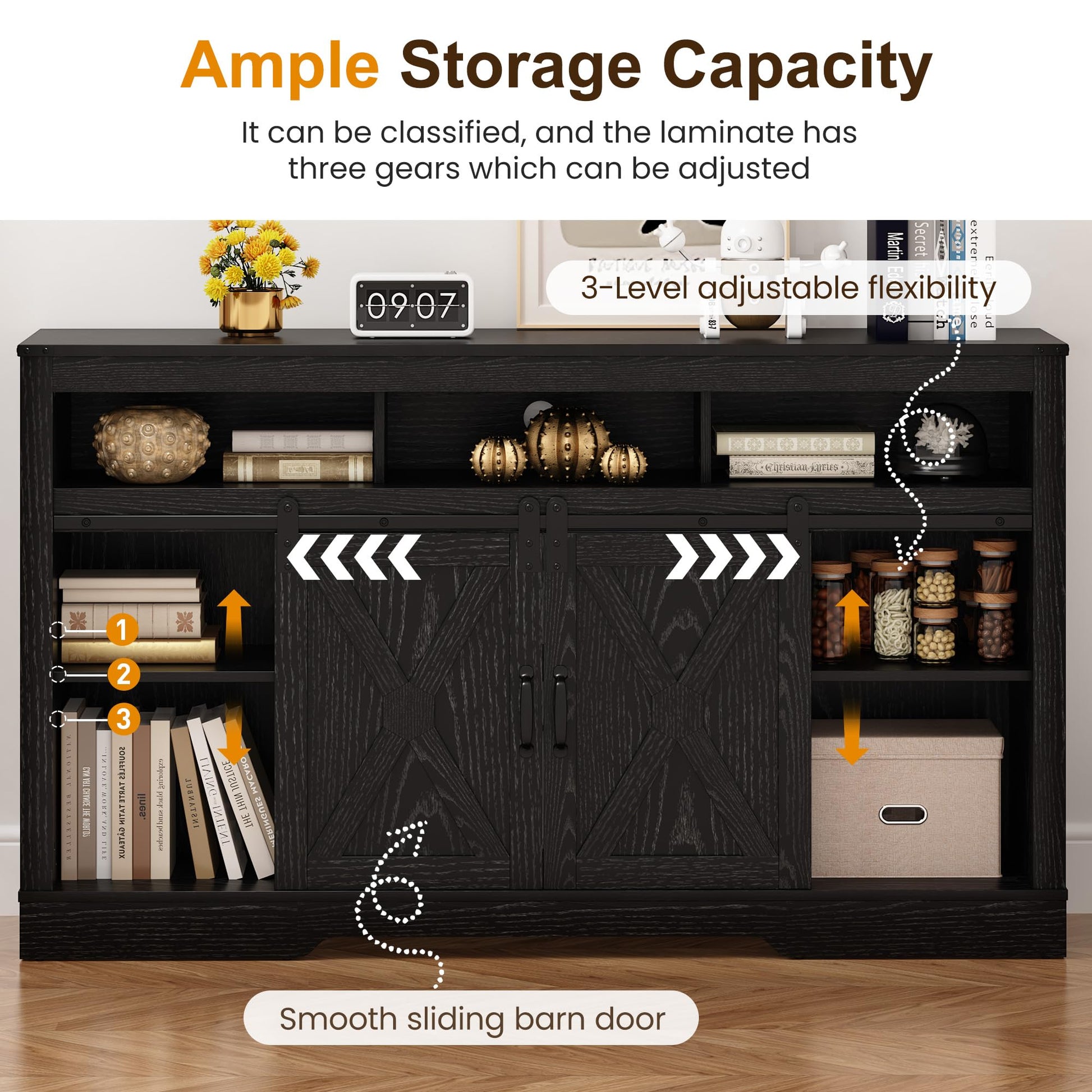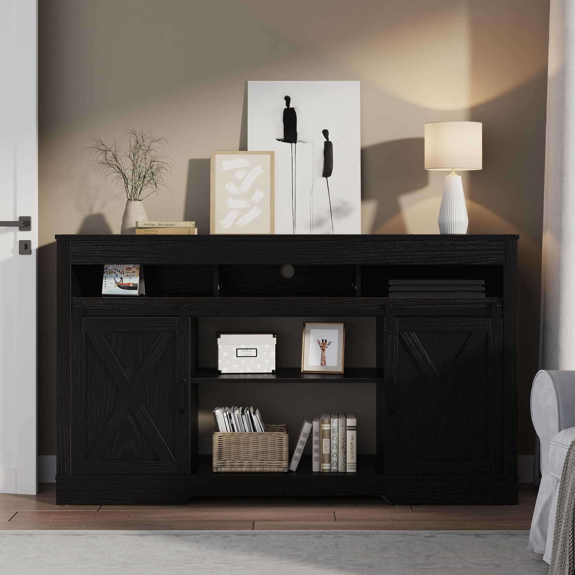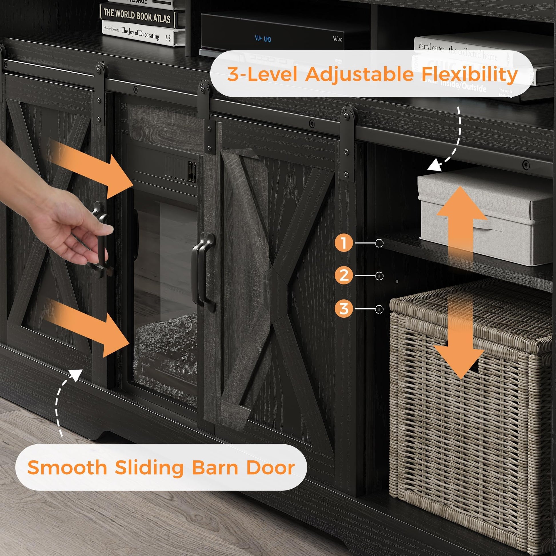 This tall entertainment center combines rustic charm with modern functionality, featuring a built-in 23" fireplace and sliding barn door design. Perfect for living rooms, this TV console accommodates televisions 65 inches and larger while providing ample storage space.