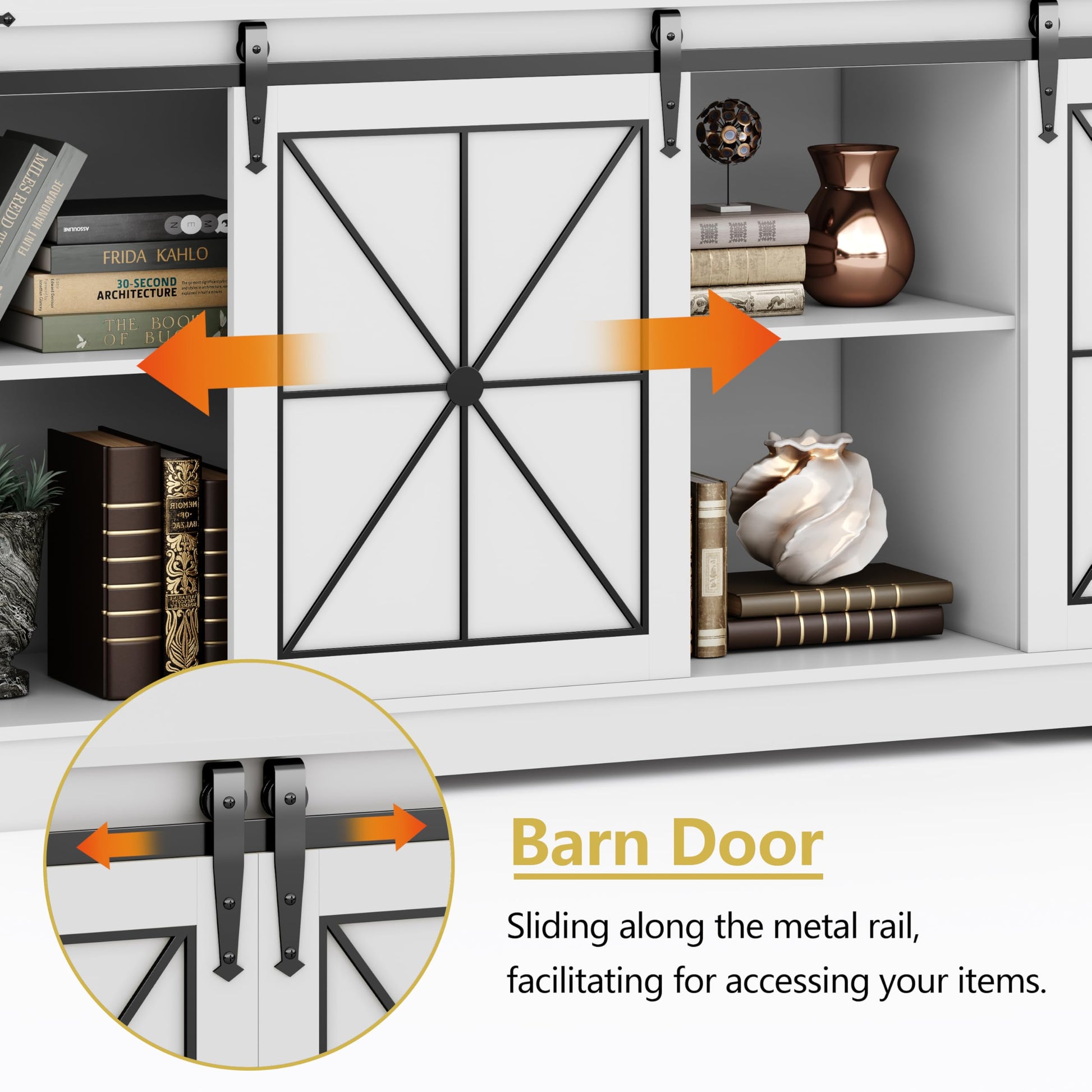- Sliding Barn Doors: Two smooth-gliding barn doors with movable metal rails provide convenient, noiseless access to cabinets and shelves