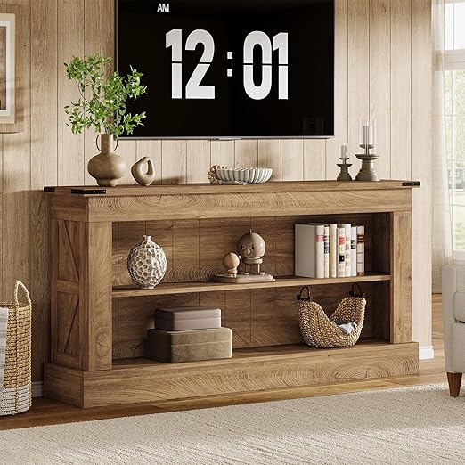 This modern farmhouse entertainment center combines style and functionality, perfect for organizing your living room or bedroom. The spacious design accommodates TVs up to 70 inches while providing ample storage for media devices, gaming consoles, and accessories.