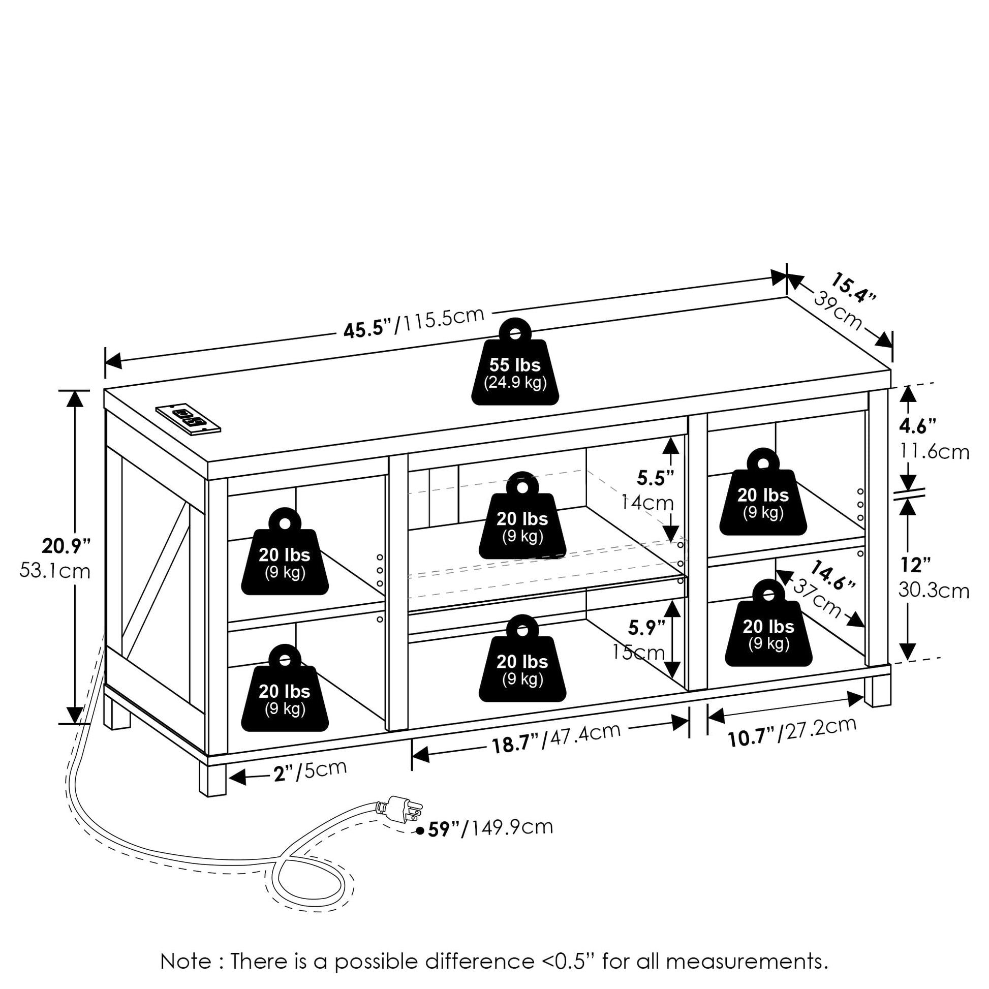 15.4"D x 45.5"W x 20.9"H