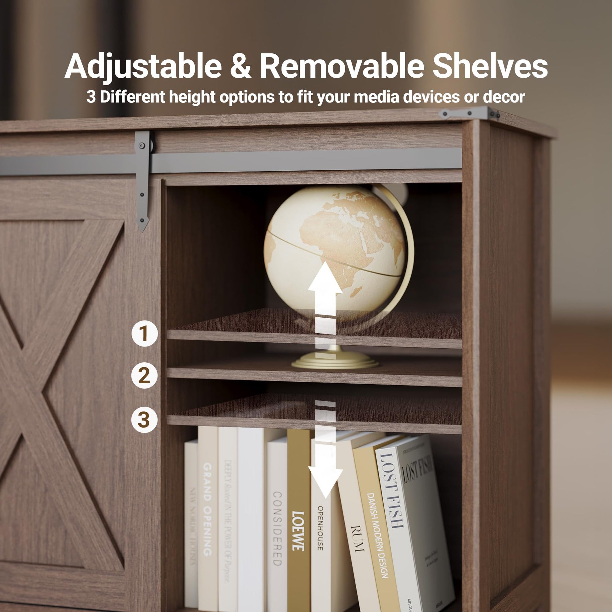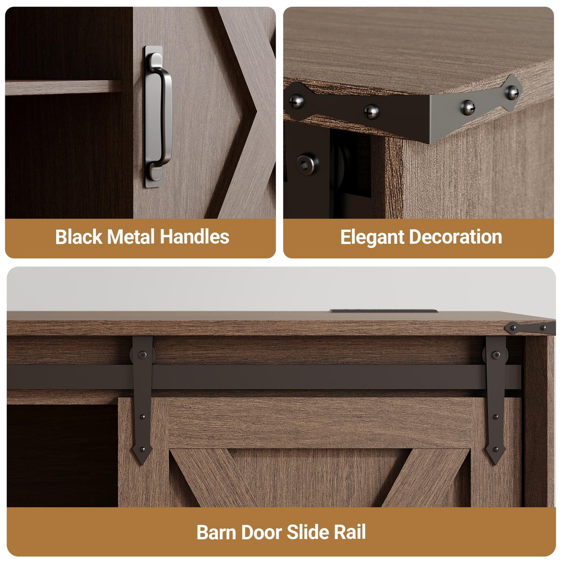 - Sliding Barn Door Design: Smooth-gliding steel barn doors conceal side storage cabinets and center shelves