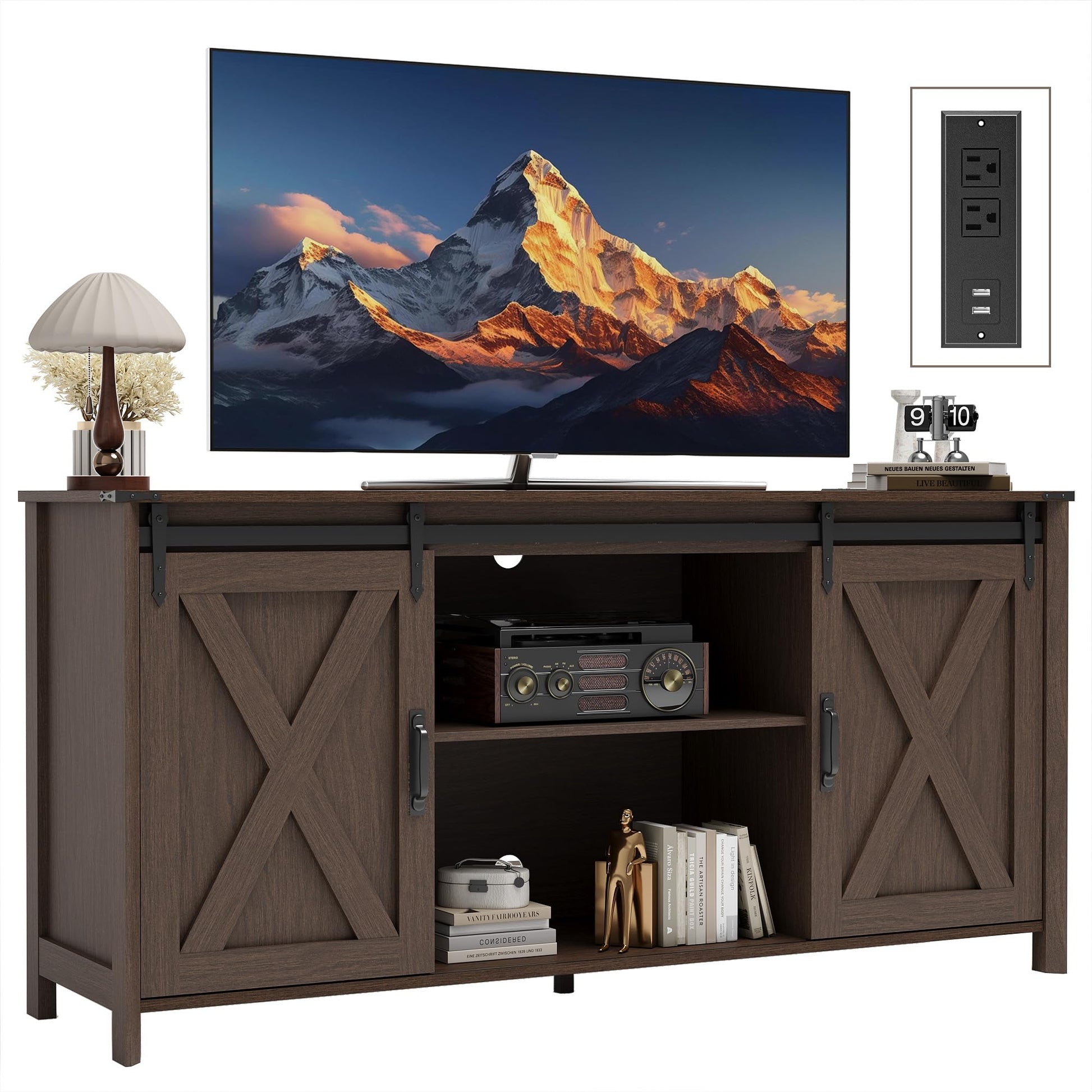 Farmhouse TV Stand with Power Outlet and Sliding Barn Doors