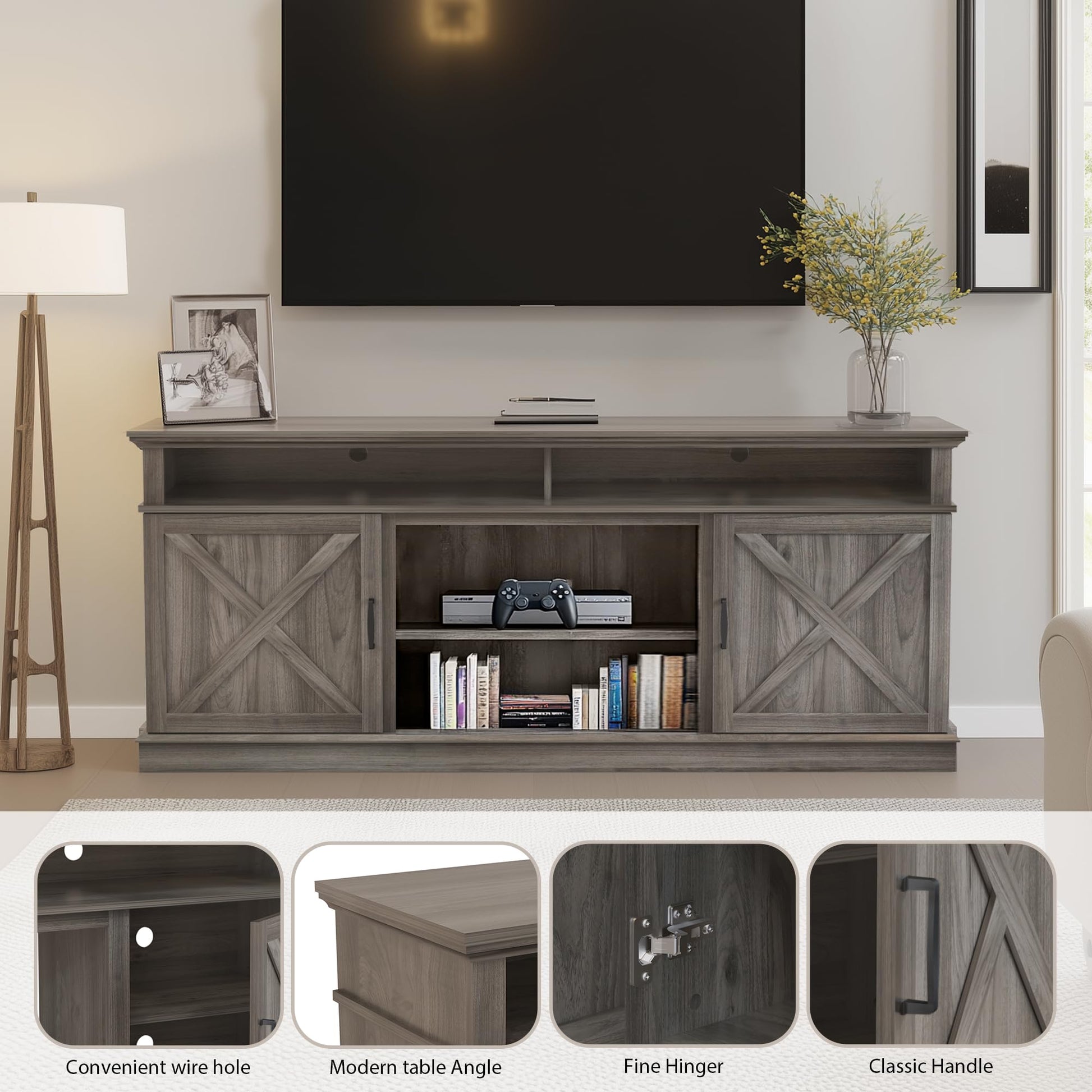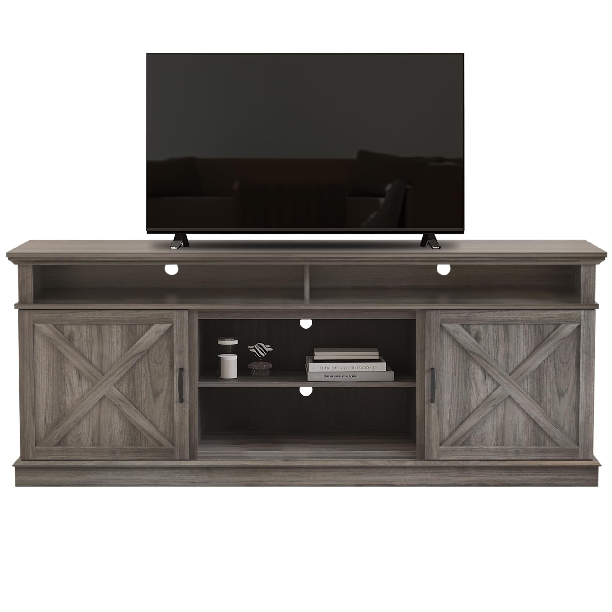 - Versatile Design: Accommodates flat screen TVs up to 80 inches with a spacious upper compartment (33"W x 4.7"H) for media devices and décor