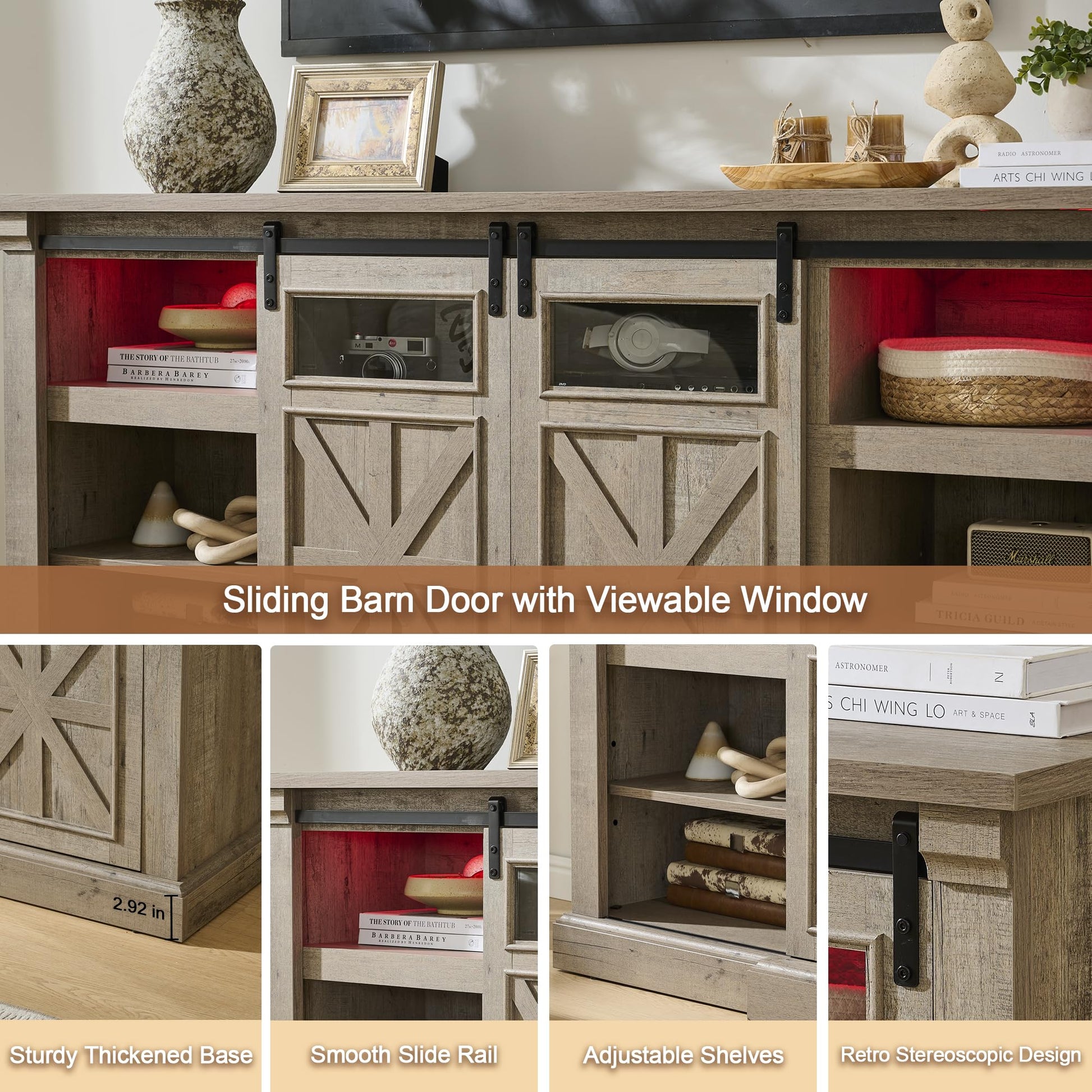 Transform your living room with this farmhouse-style entertainment center featuring an integrated electric fireplace and rustic sliding barn door design. This tall TV console accommodates televisions up to 80 inches while providing warmth and ambiance with LED flame effects.