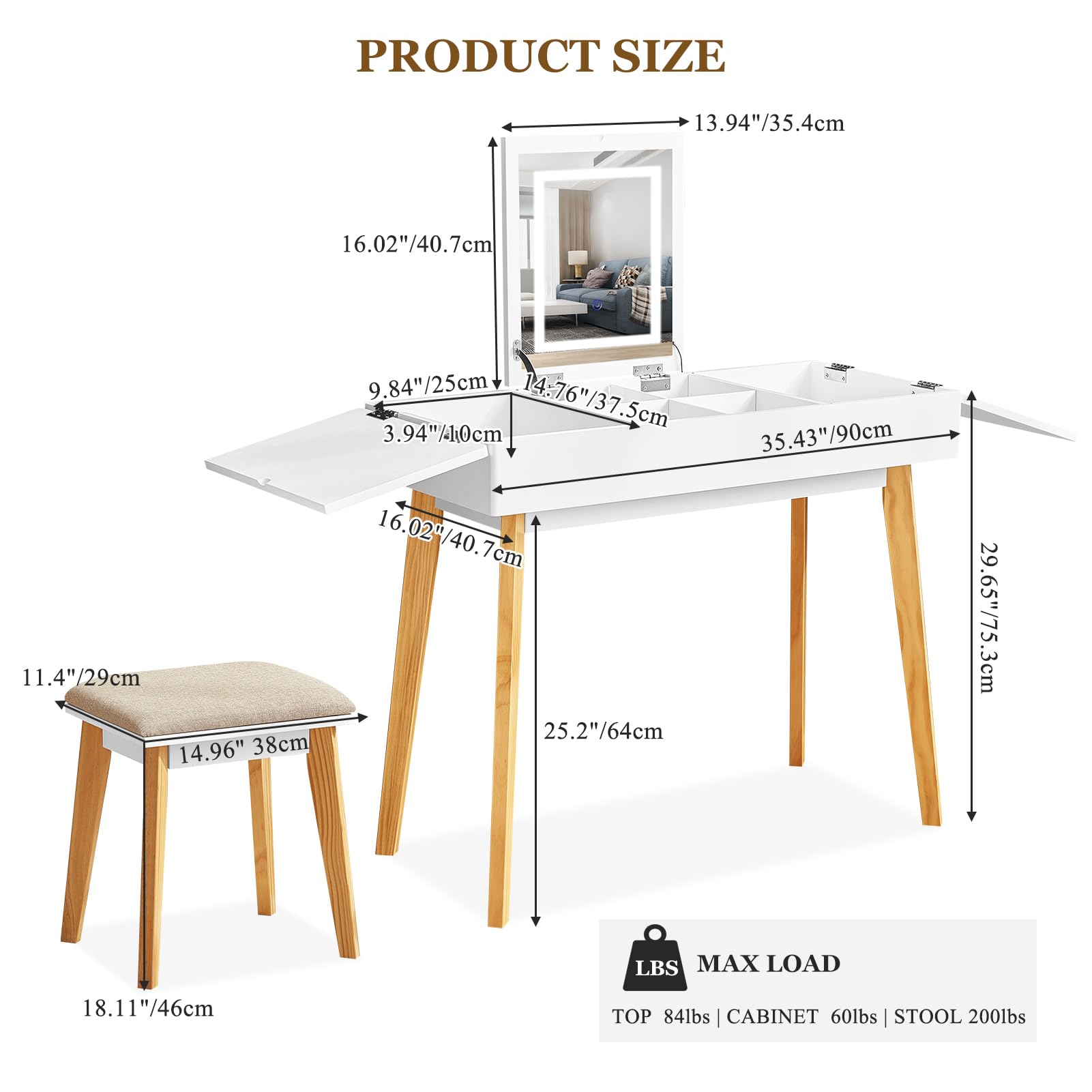 - Dual-Function Design: Flip-top mirror converts the vanity into a writing desk when closed
