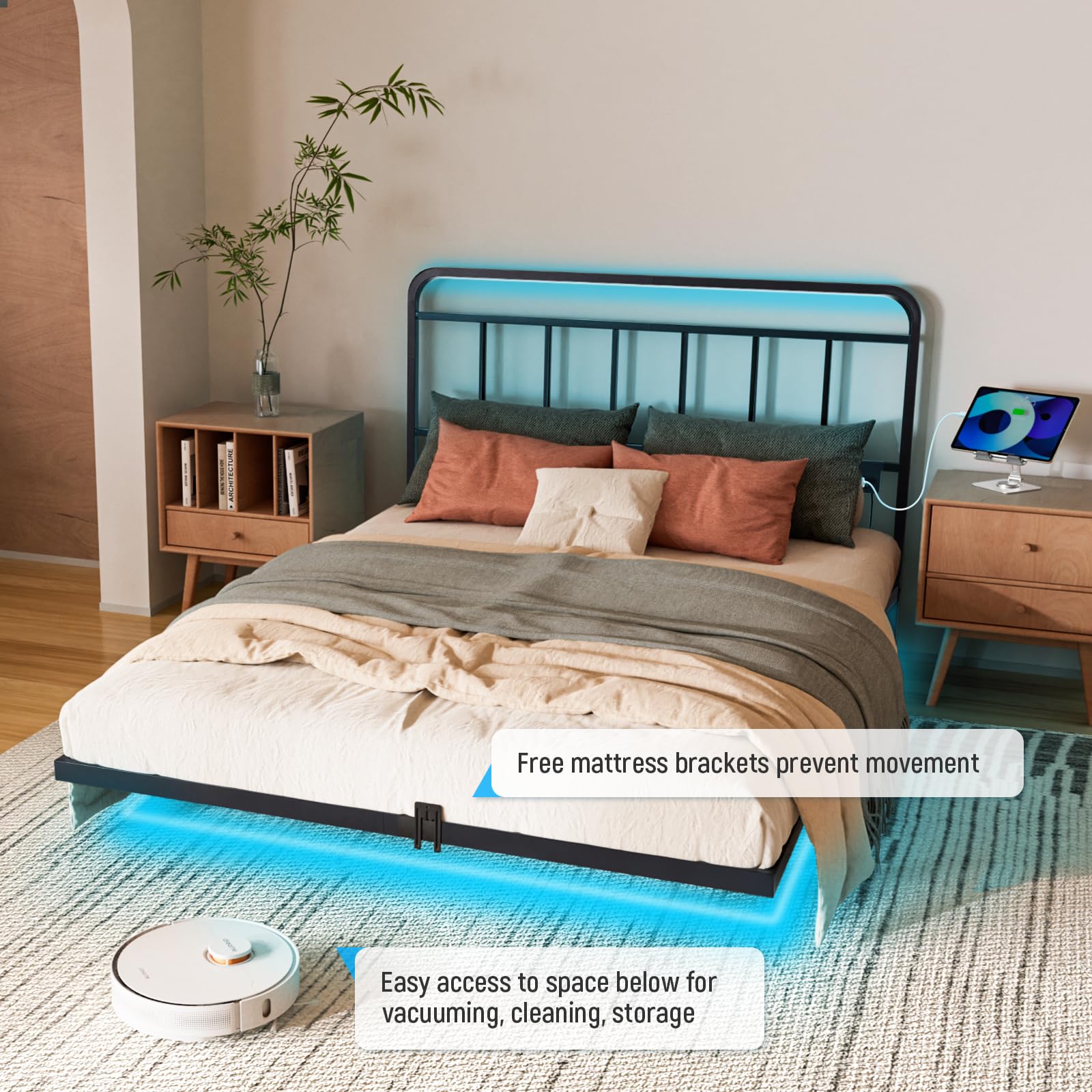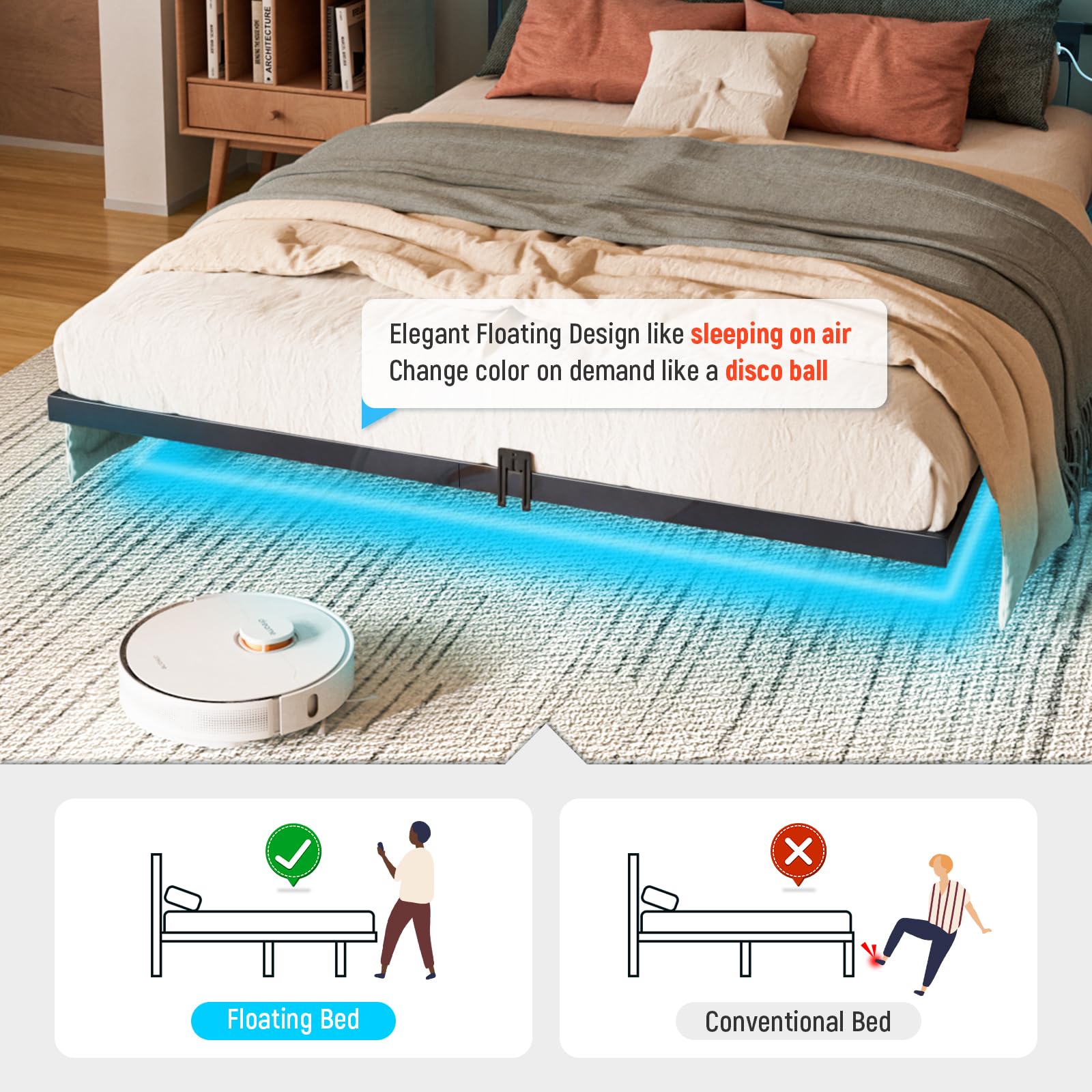 Floating Full Size Platform Bed Frame with LED Lights & Charging Station