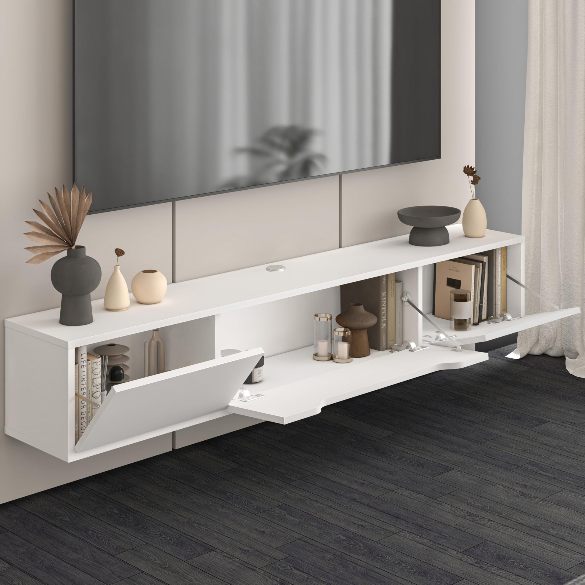 Transform your living space with this sleek floating TV stand designed to accommodate televisions up to 80 inches. Featuring handle-free doors and a contemporary two-tone finish, this wall-mounted media console combines sophisticated design with practical hidden storage solutions.
