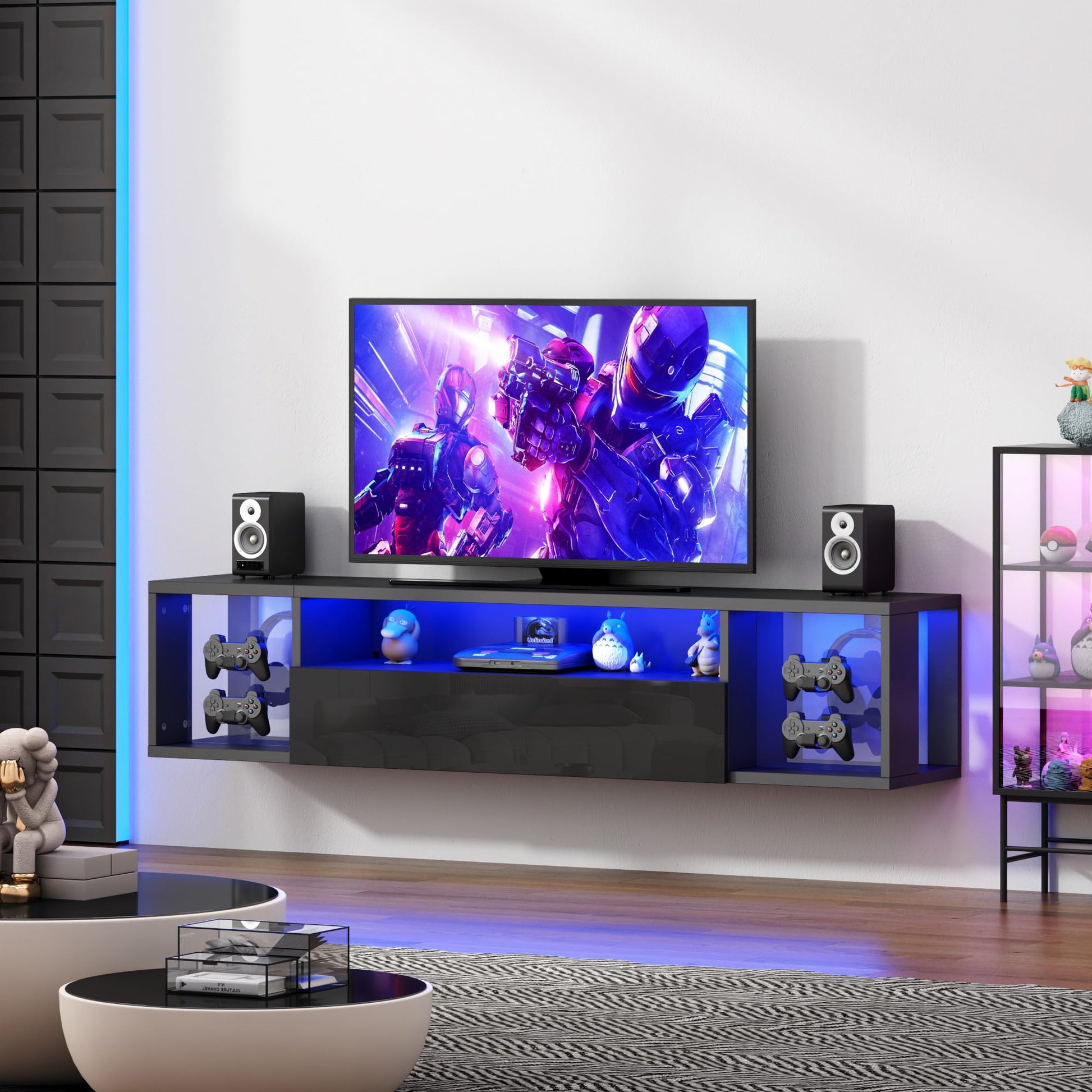 Transform your entertainment space with this wall-mounted floating TV stand featuring 20 color-changing LED lights. Perfect for gaming and movie nights, this modern media console combines style with functionality.