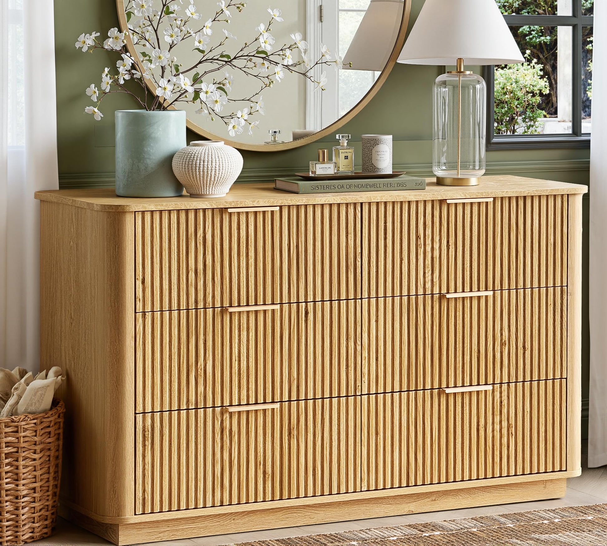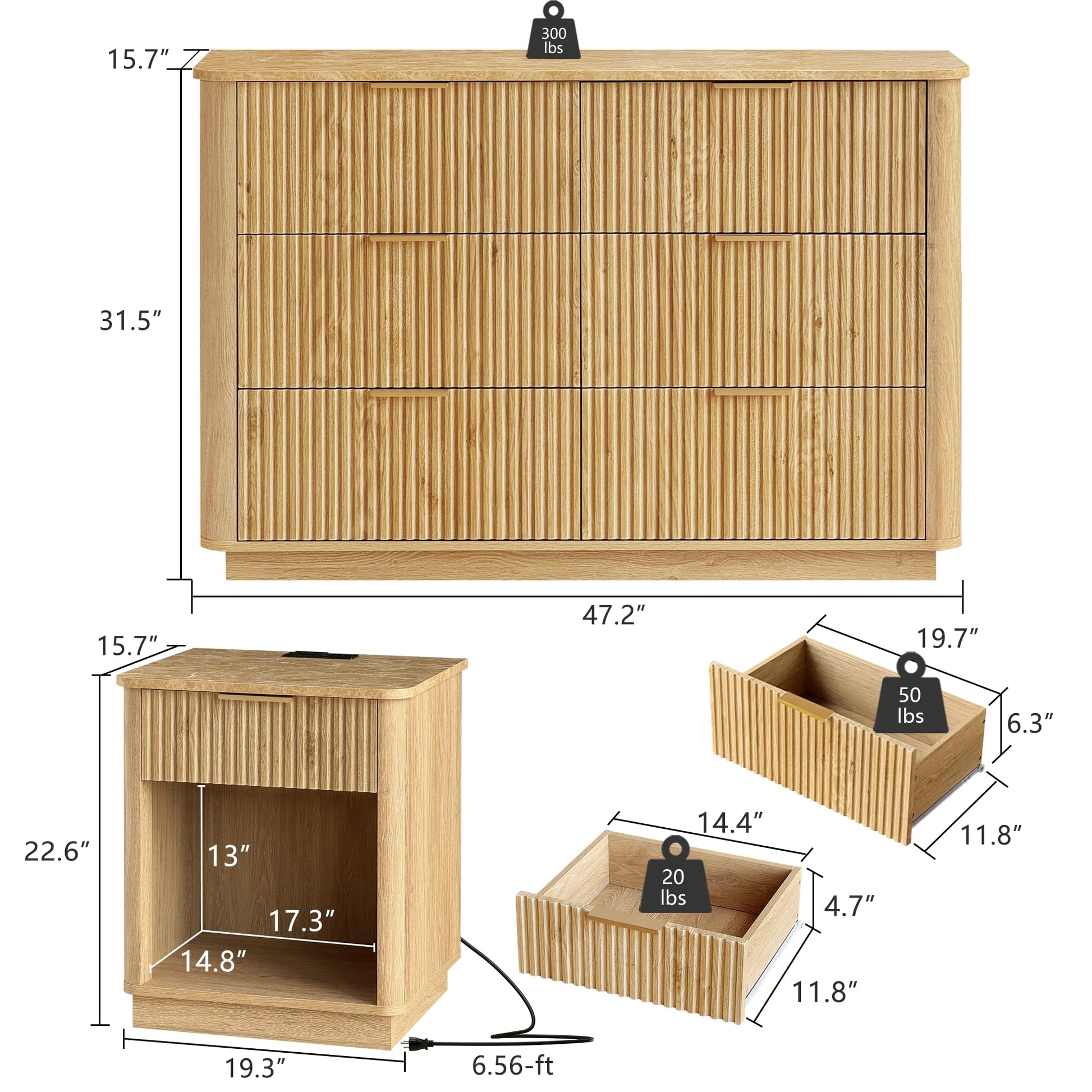 Infuse your space with timeless elegance through this fluted 6 drawer dresser and nightstands set, featuring gently sculpted fluted drawer fronts and a smooth faux marble top. The soft oak finish highlights the natural wood grain, creating a light and refreshing atmosphere for modern interiors.